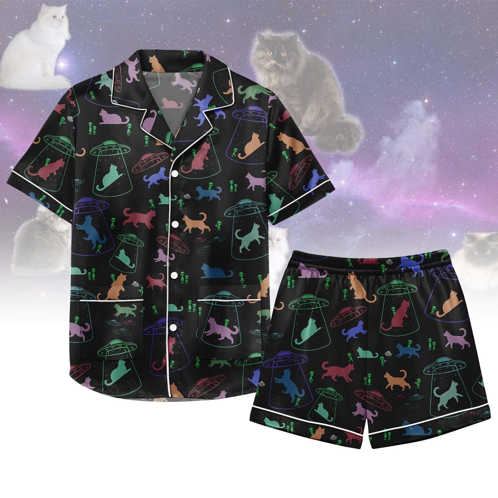 Alien Cat Satin Pajamas Short Set, Ufo Women Sleepwear, Funny Sci Fi Pjs, Cat Women Loungewear, Cute Galaxy Cat Pjs, Halloween Gift
