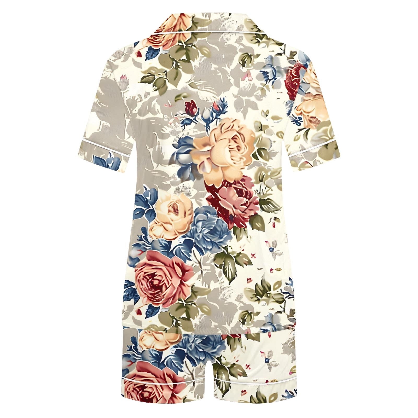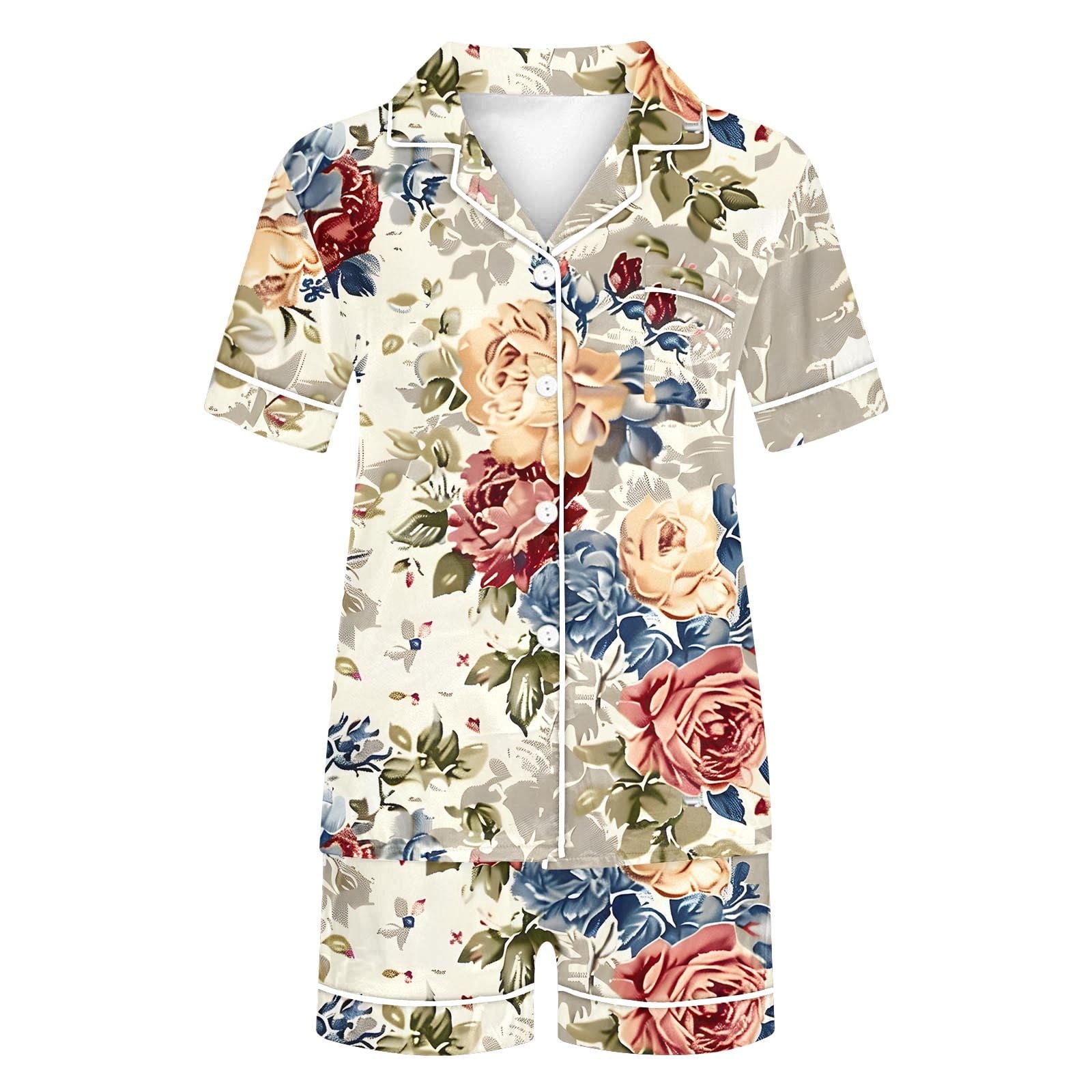 Aloohaidyvio Womens Silk Satin Pajama Set Print Short Sleeve Sleepwear Button Down Pjs Shorts Set Loungewear Sizes L