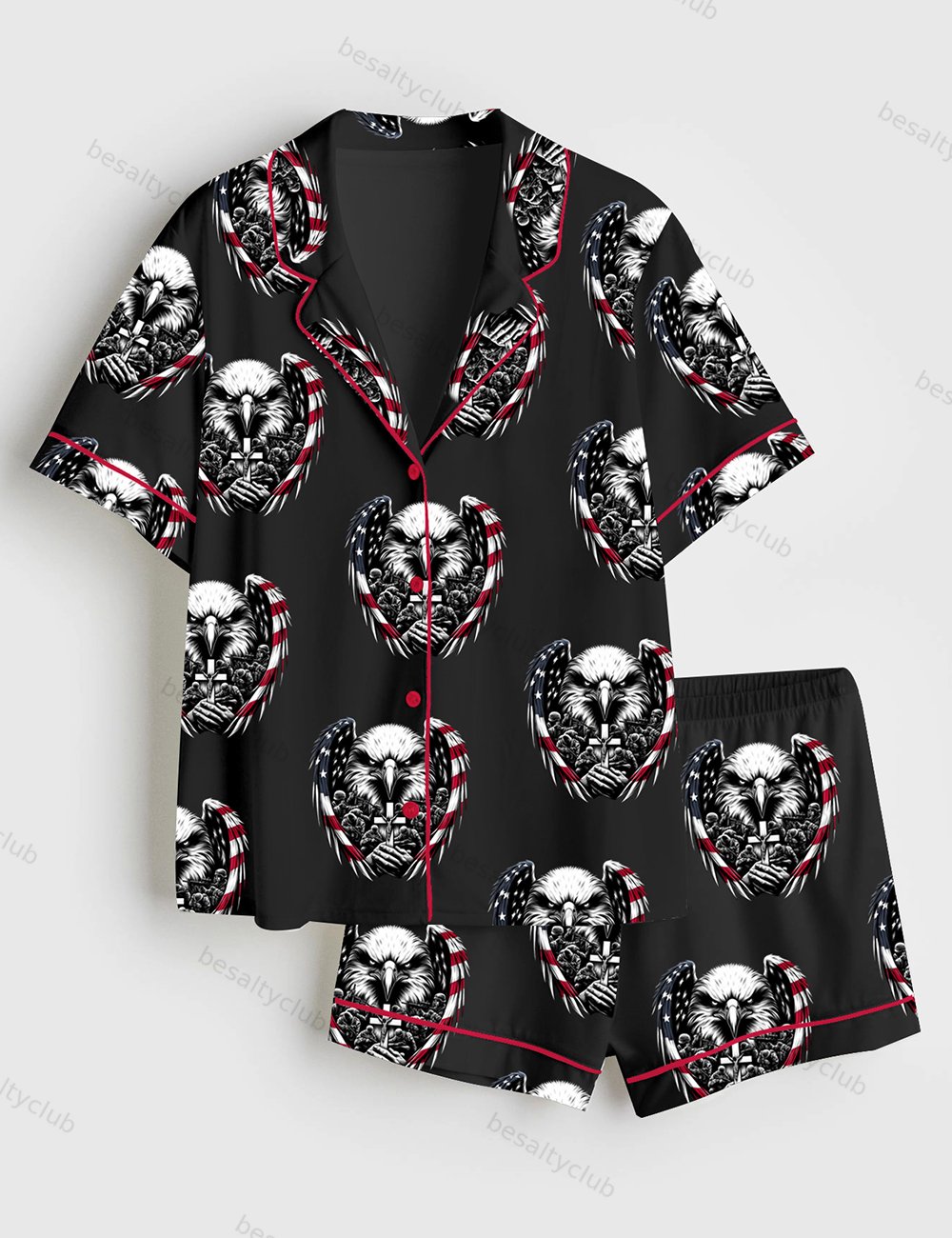 American Flag Eagle 4th Of July Eagle Through Flag Memorial Day Print Short Sleeve Satin Pajama Set