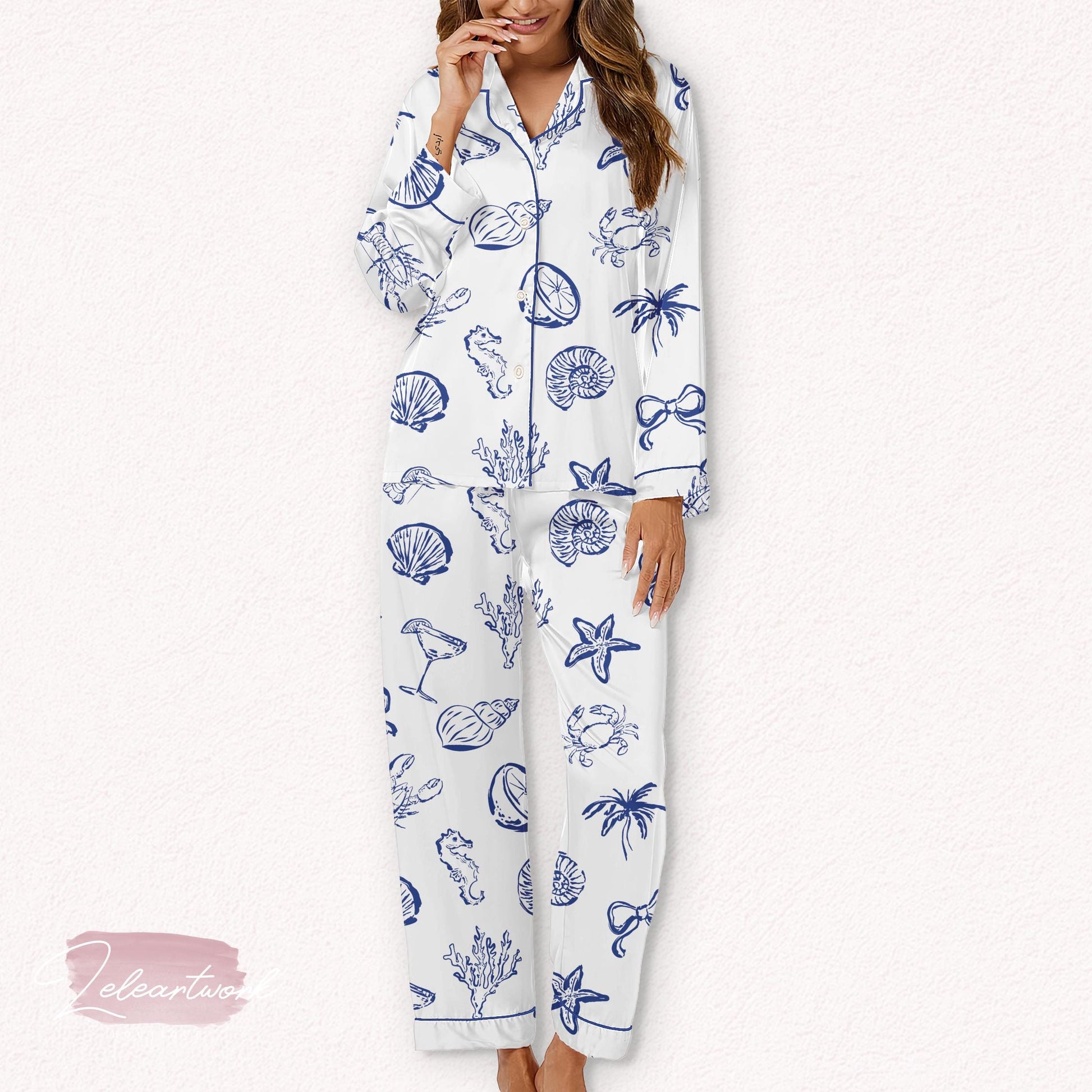 Beach Coastal Set – Nautical Summer Pajamas with Seashell, Coral & Cocktail Print | Ocean Lover Loungewear | Resort Sleep Set