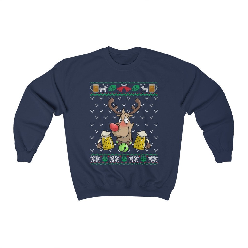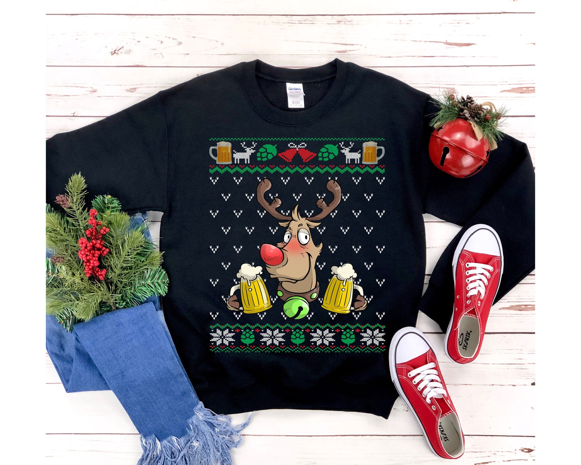 Beer Drinking Rudolph Ugly Christmas Sweatshirt, Funny Beer Lover Gift for Dad, Xmas Clothes, Beer Holiday Party Shirt Unisex Crewneck