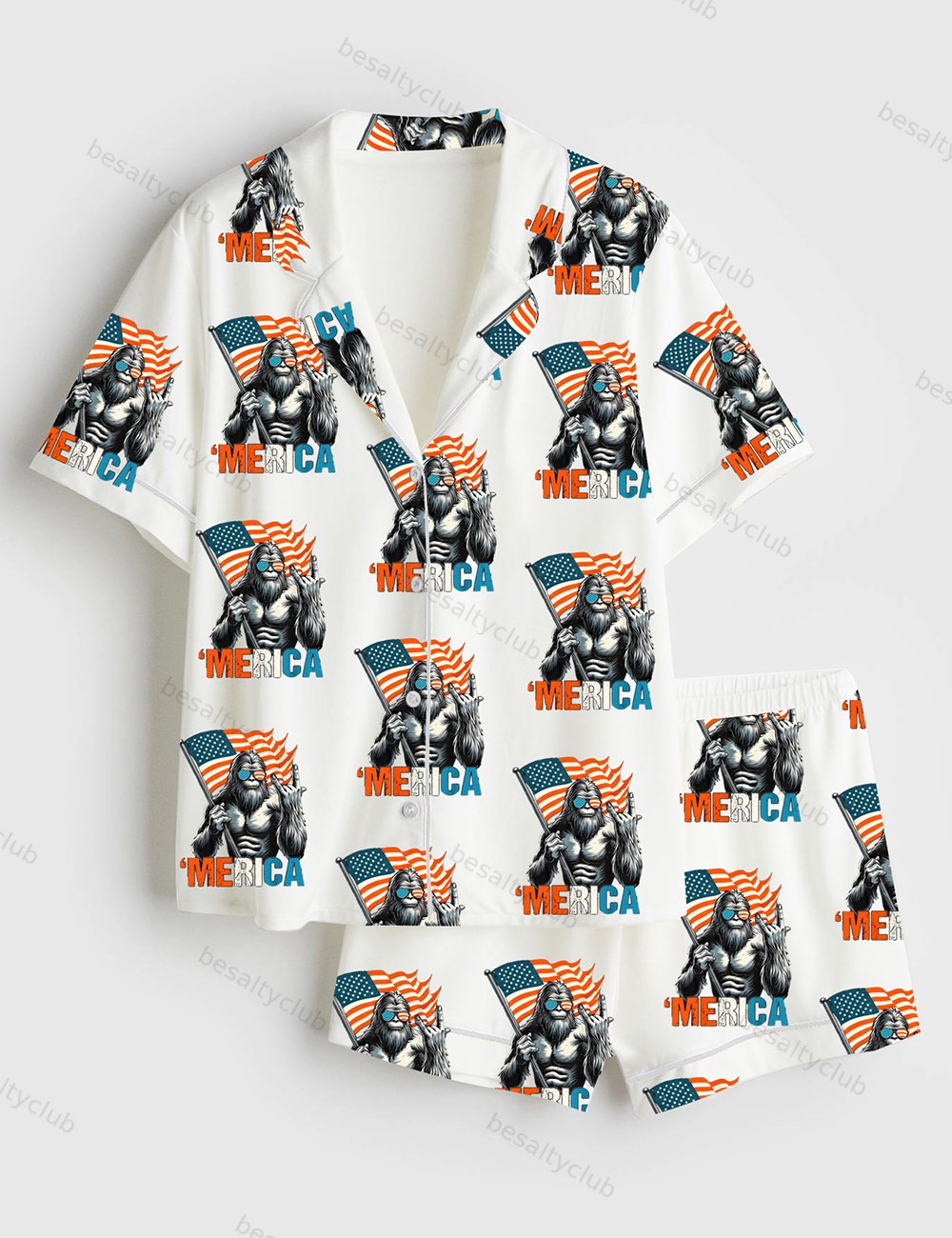 Bigfoot Merica 4th Of July Rock American Flag Patriotic Independence Day Short Sleeve Satin Pajama Set