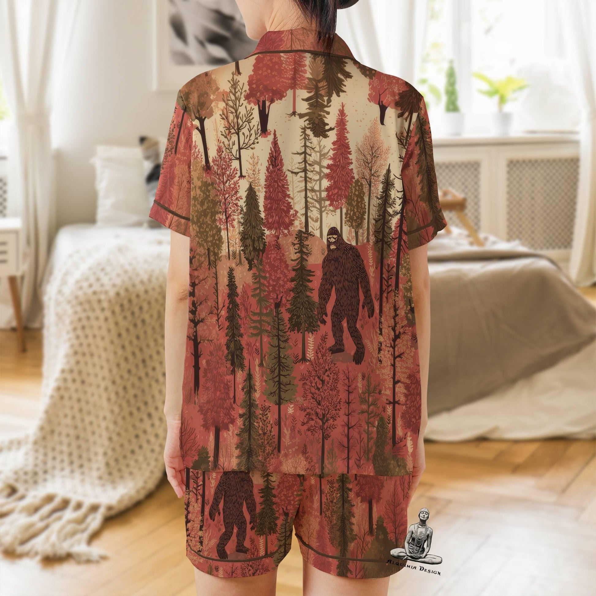 Bigfoot Pajama Set Short Sleeves, Sasquatch Woman's Satin Pajama Short Sleeve Shorts Big foot Gift