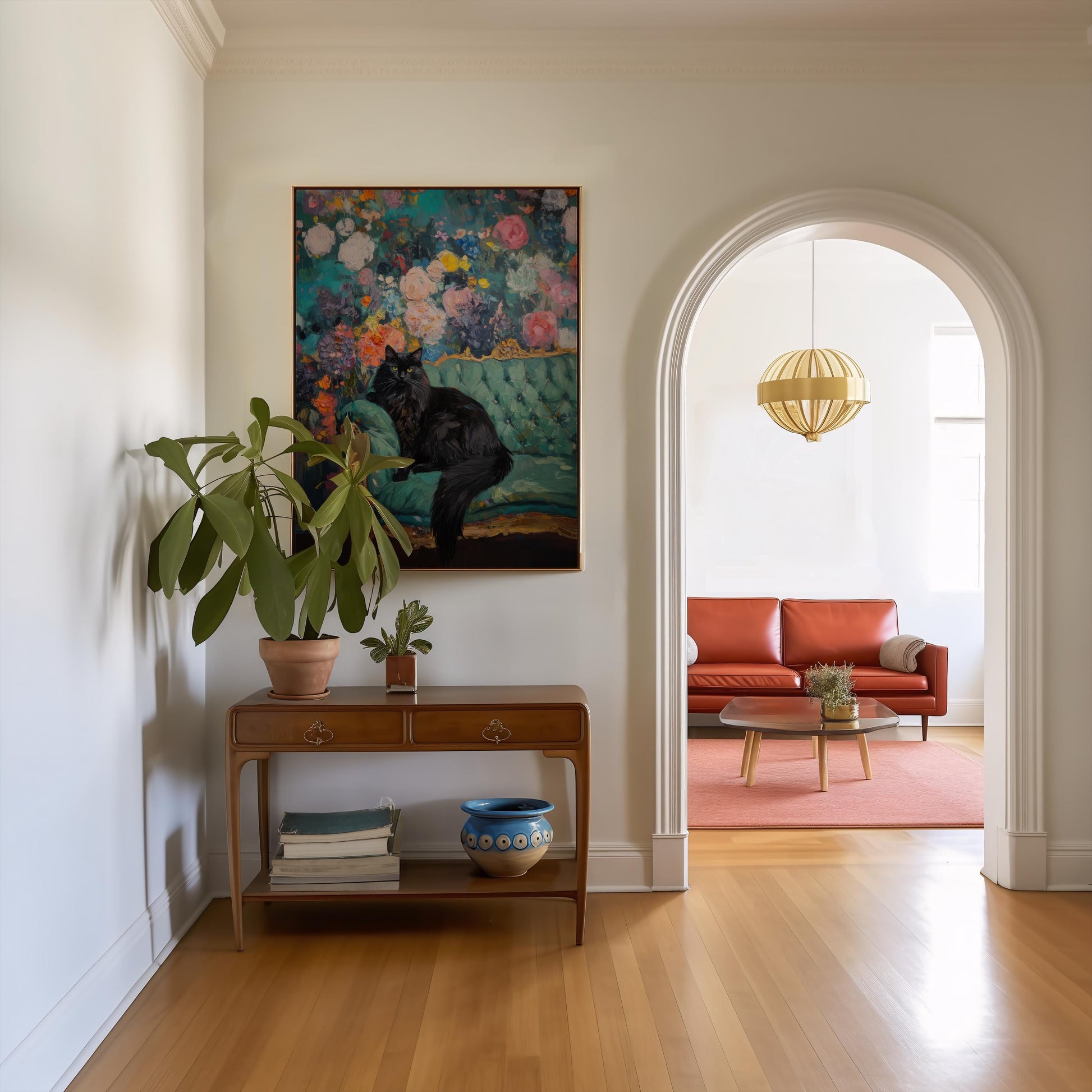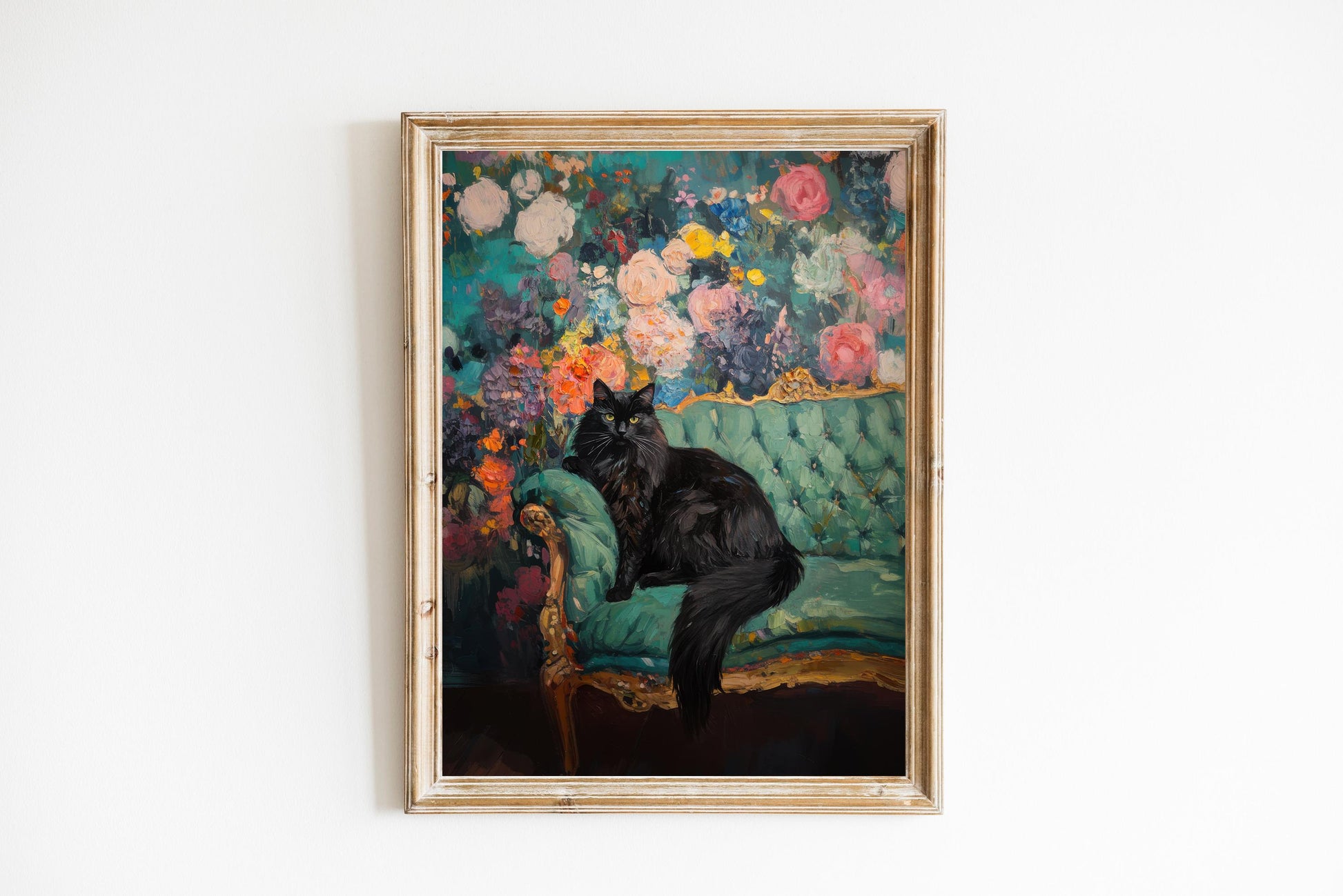 Black Cat Floral Art Print: Quirky Retro Home Decor