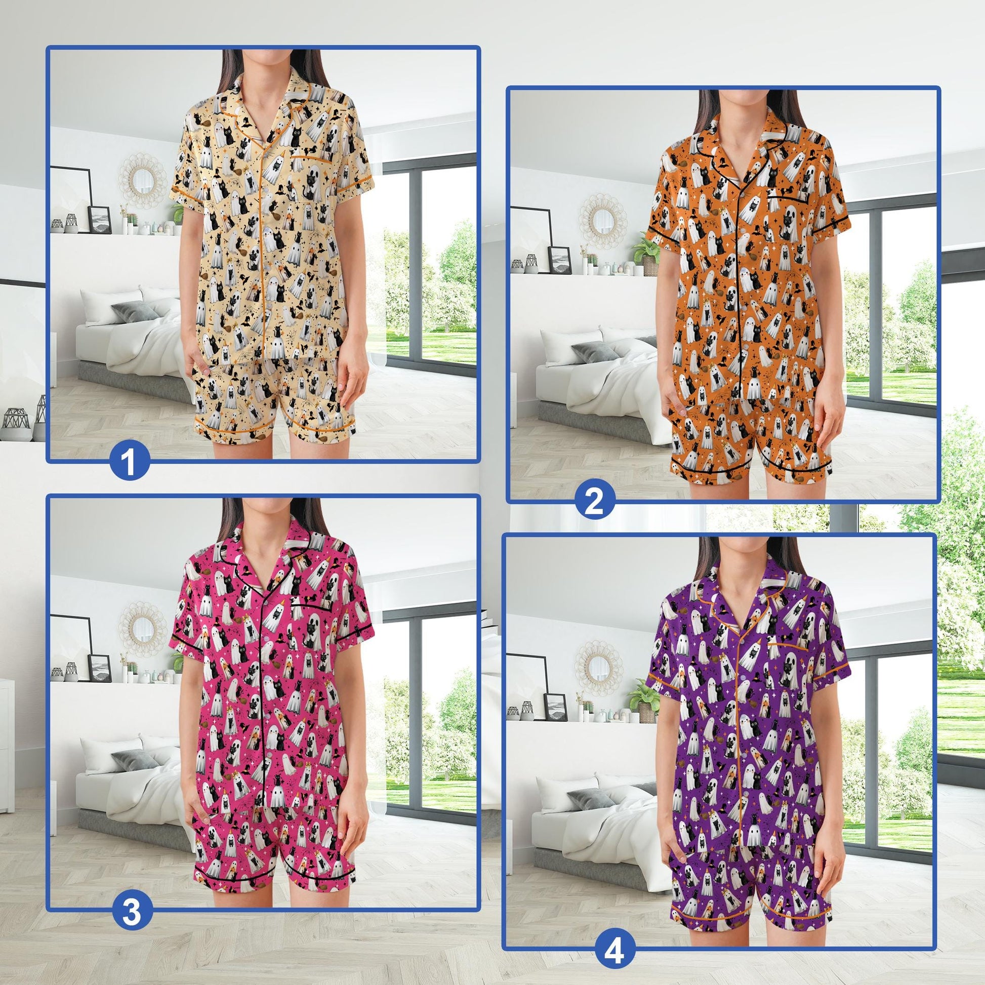 Black Cat Halloween Satin Pajamas Set, Spooky Season Pajama Set, Boo Ghost Cat Lover Sleepwear, Funny Cat Mama Halloween Pajamas Set
