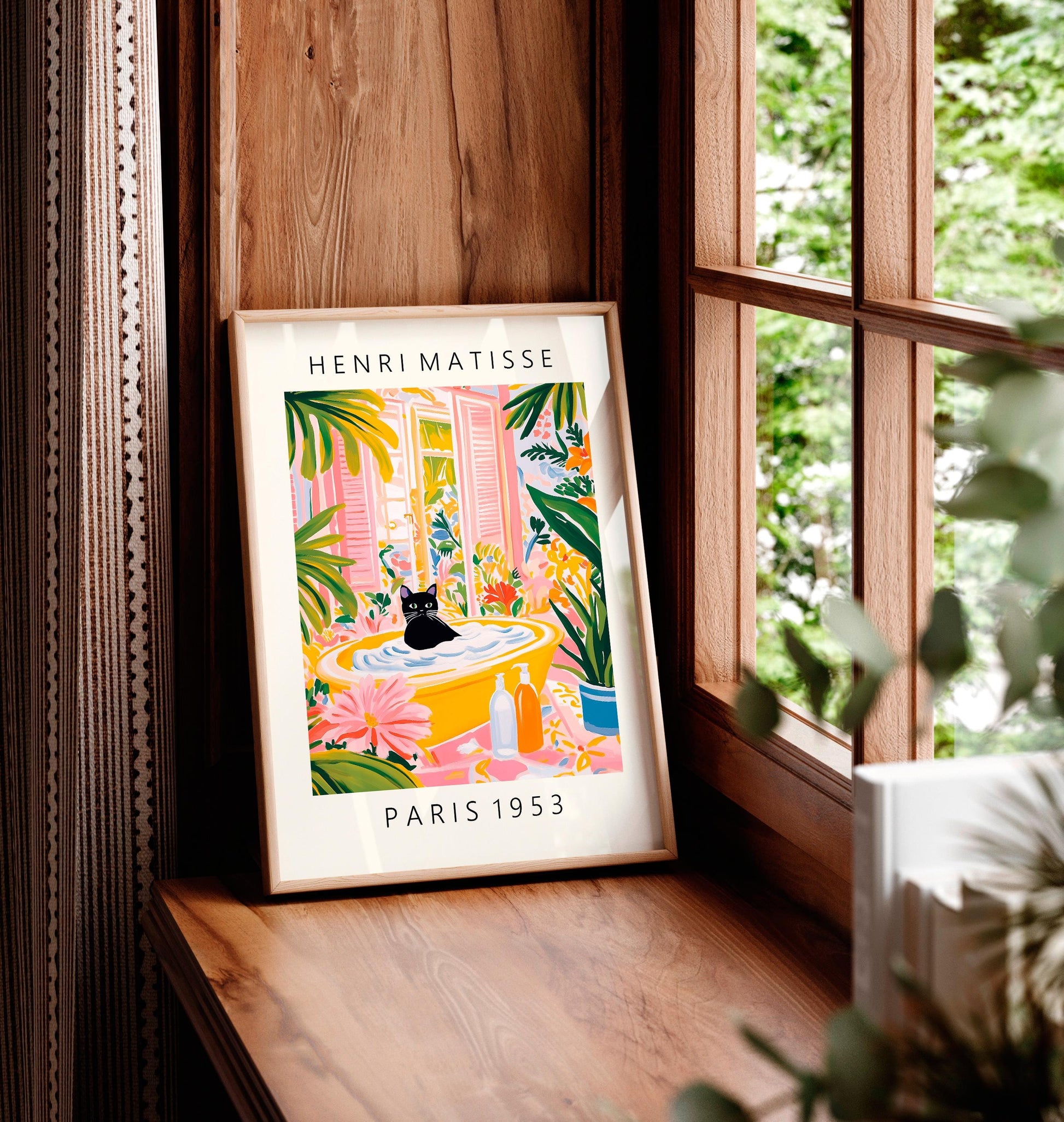 Black Cat in Bathtub Print: Matisse Style Bathroom Wall Art