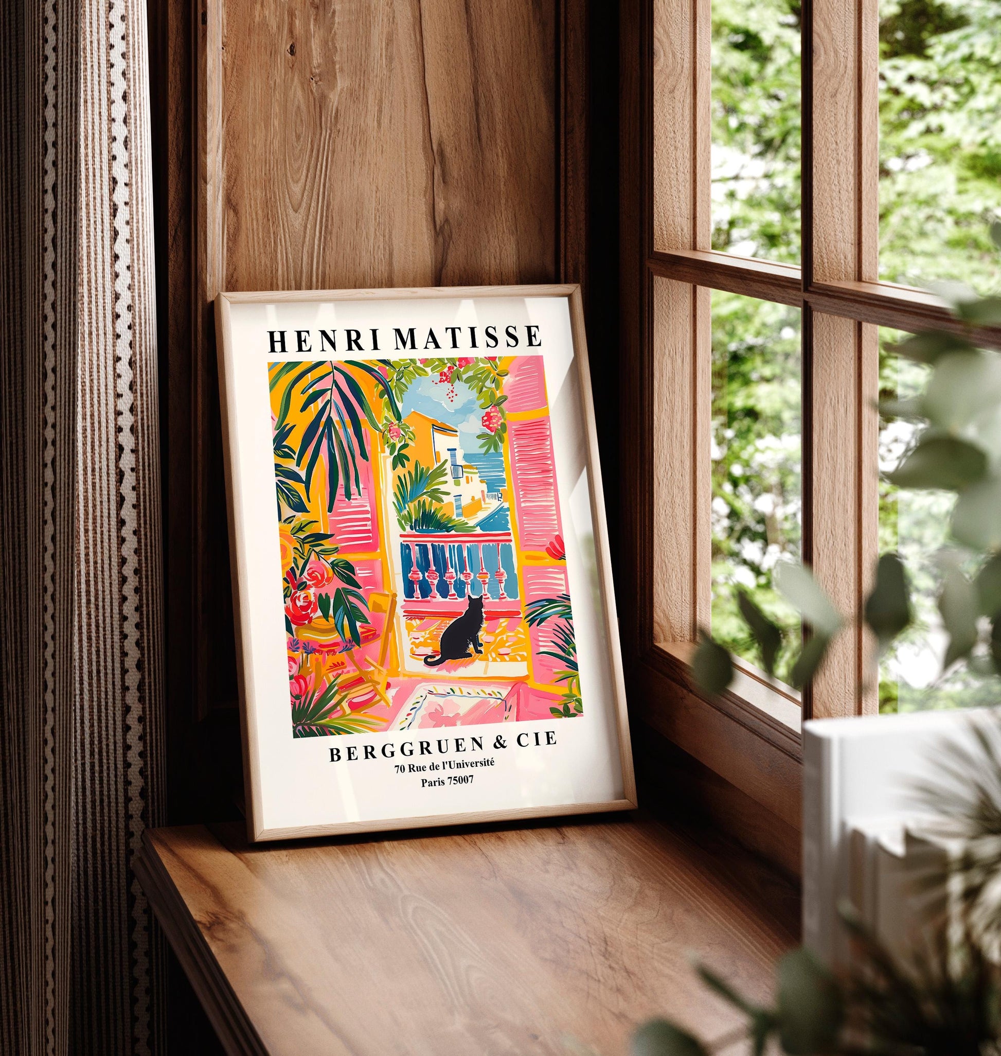 Black cat Matisse print, Beachy decor, Pink dopamine art, Mid century modern poster, Maximalist poster