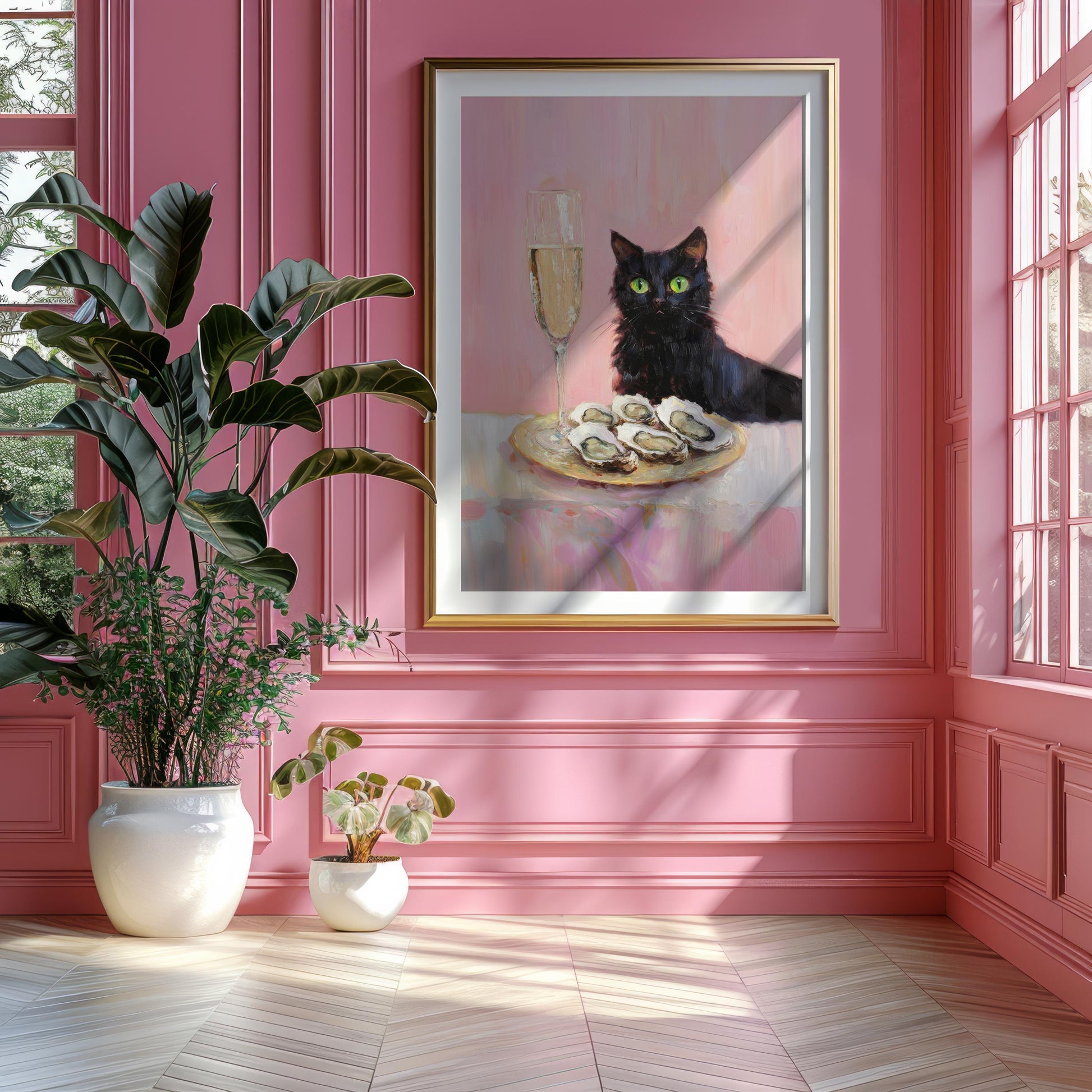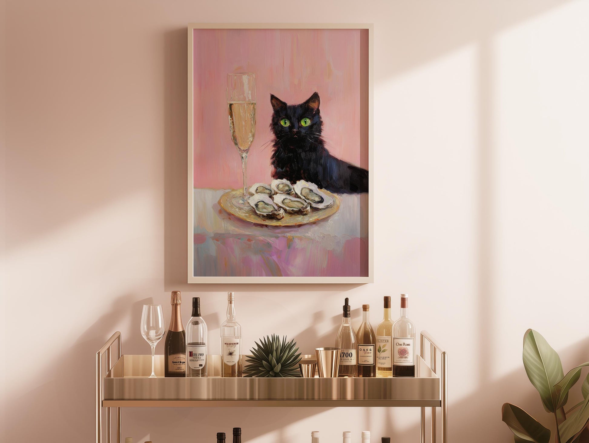 Black Cat with Champagne and Oysters Art Print | Cute Quirky Whimsical | Cocktail Art Bar Cart Decor | Fine Art Print Gift | Funny Cat Art