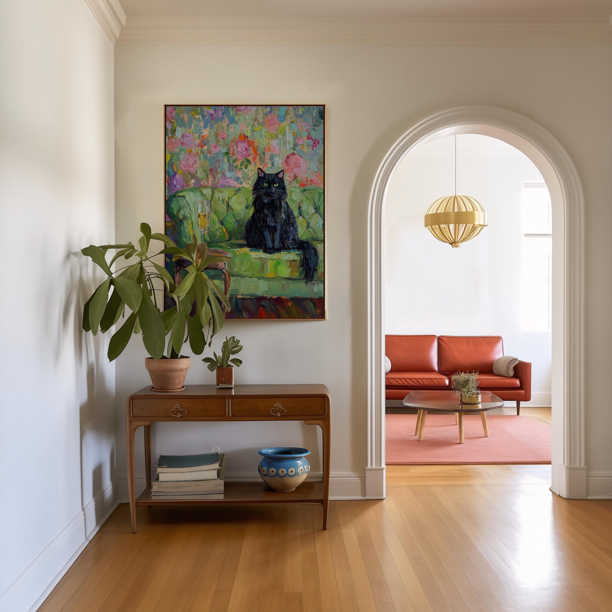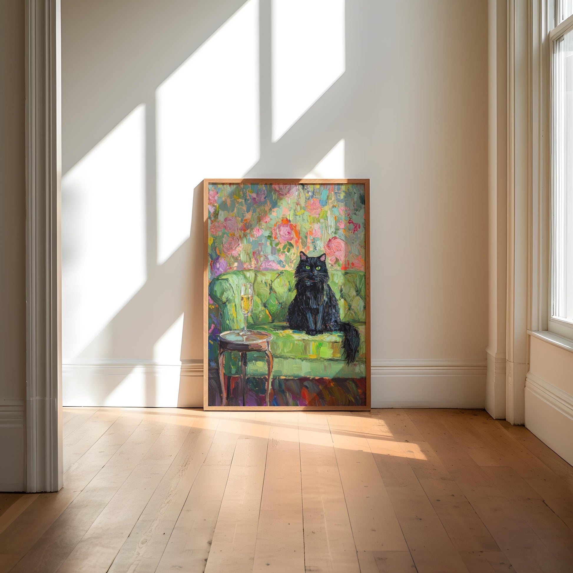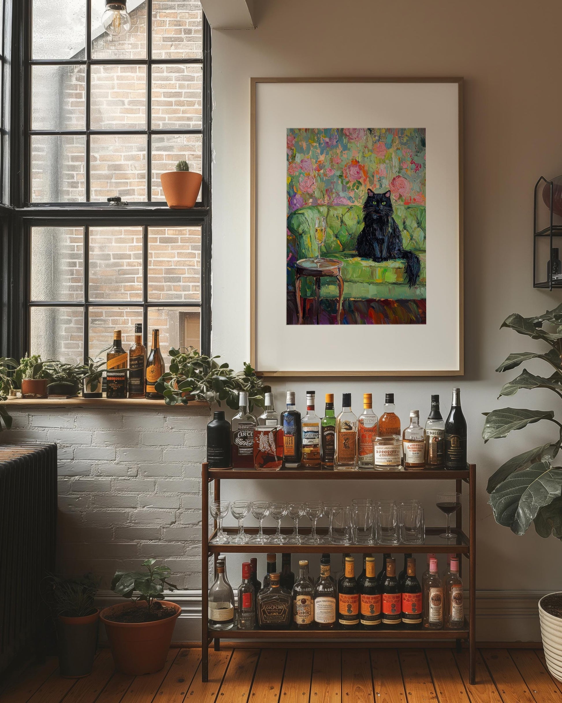 Black Cat with Champagne Art Print: Quirky Retro Bar Cart Decor