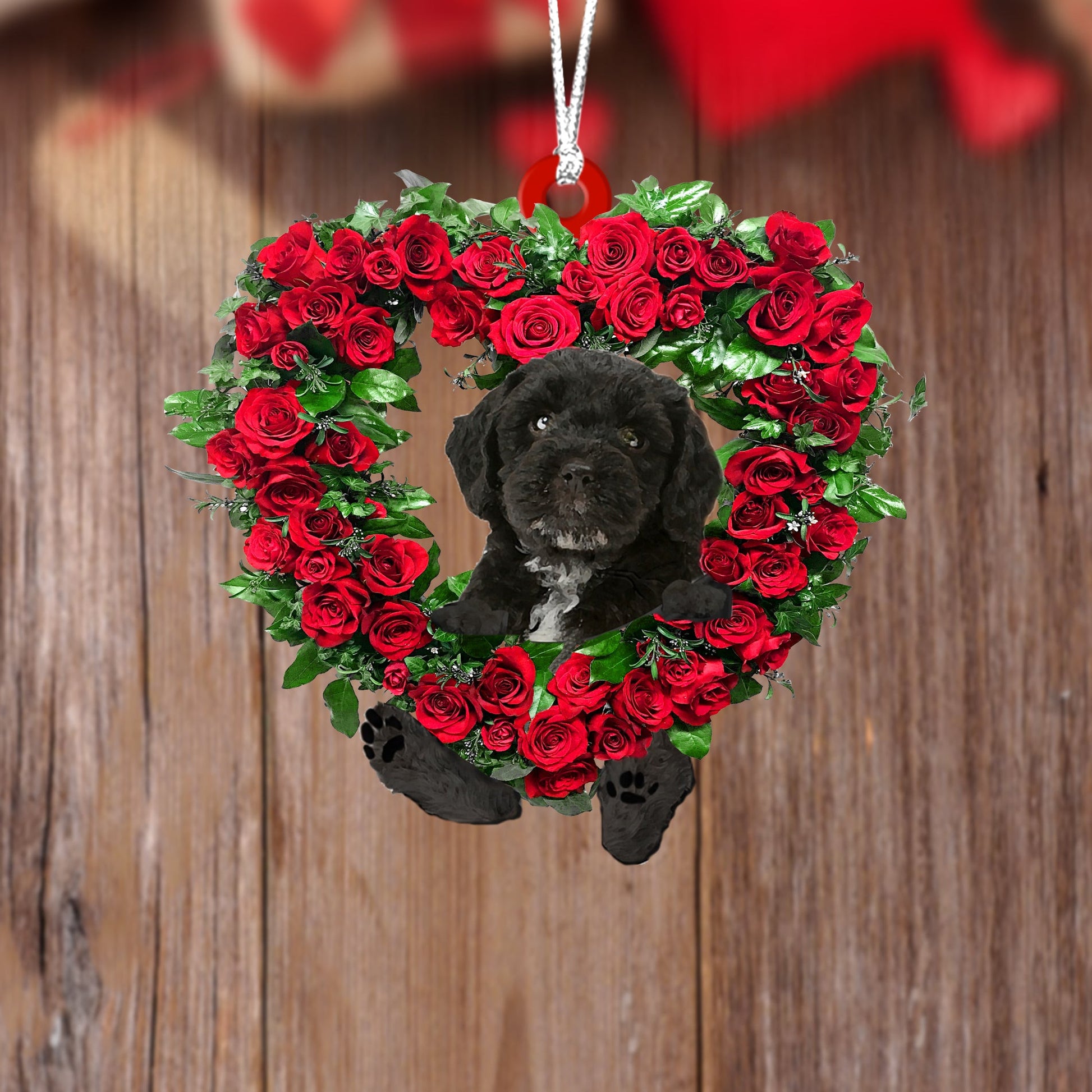 Black Cockapoo-Heart Wreath Two Sides Christmas Plastic Hanging Ornament, Christmas Ornament Gift, Christmas Gift, Christmas Decoration