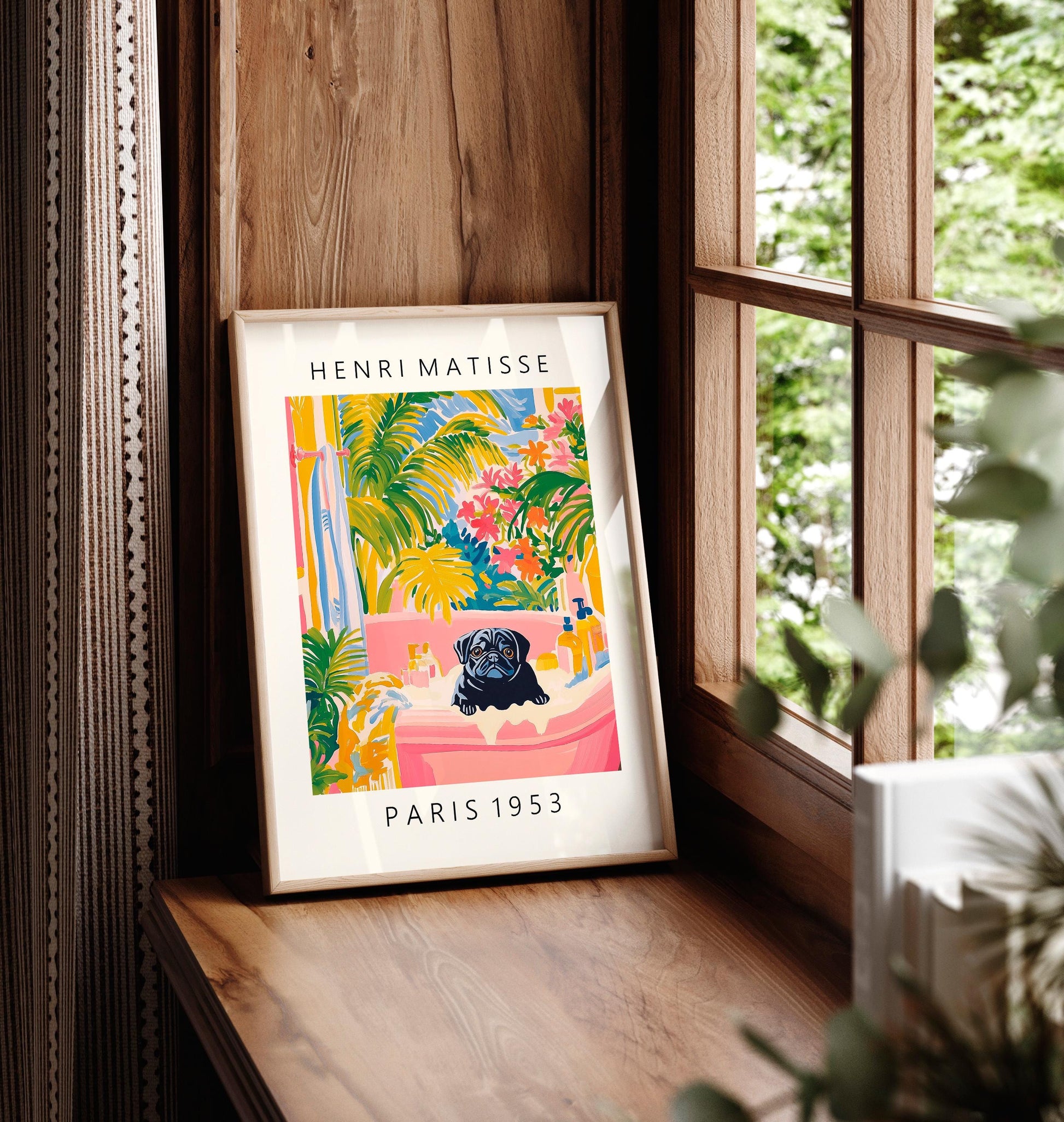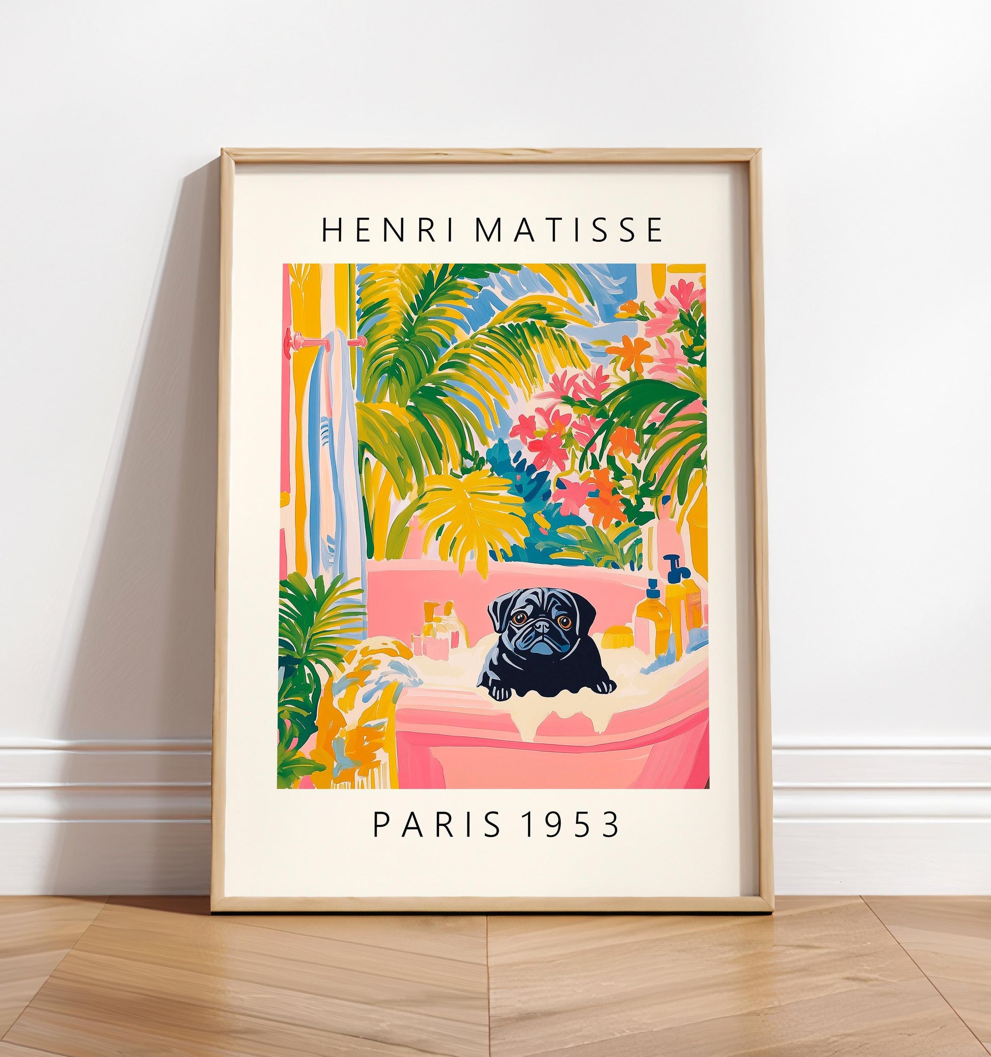 Black Pug in Bathtub Art Print: Funny Dog Bathroom Decor