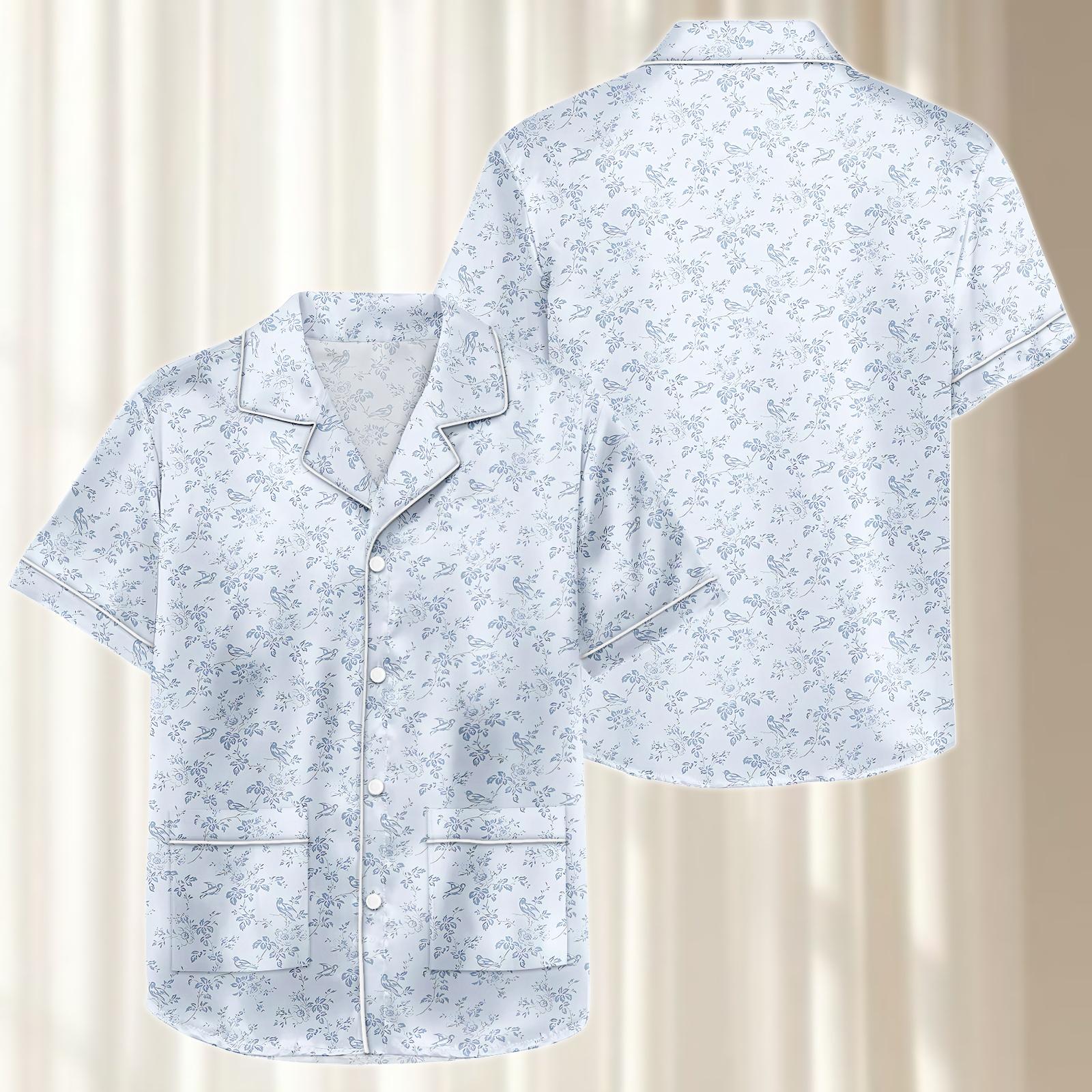 Blue Floral Satin Pajamas Short Set, Small Flower Nightwear, Soft Summer Loungewear, Matching Pajamas Set, Birthday Gift For Her