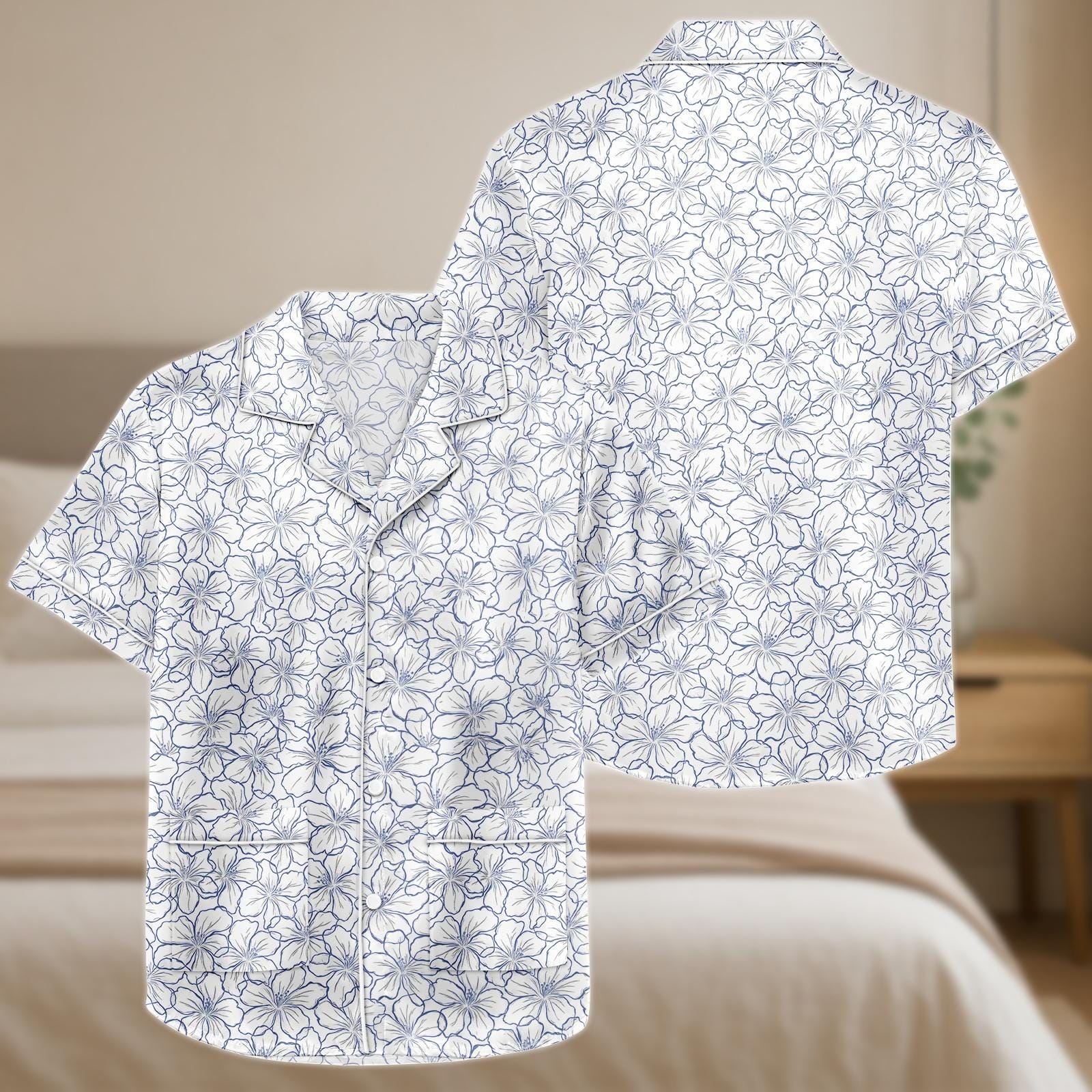 Blue Hibiscus Satin Pajama Set, Tropical Flower Print Shorts and Shirt, Lightweight Summer Sleepwear, Boho Resort Gift for Her