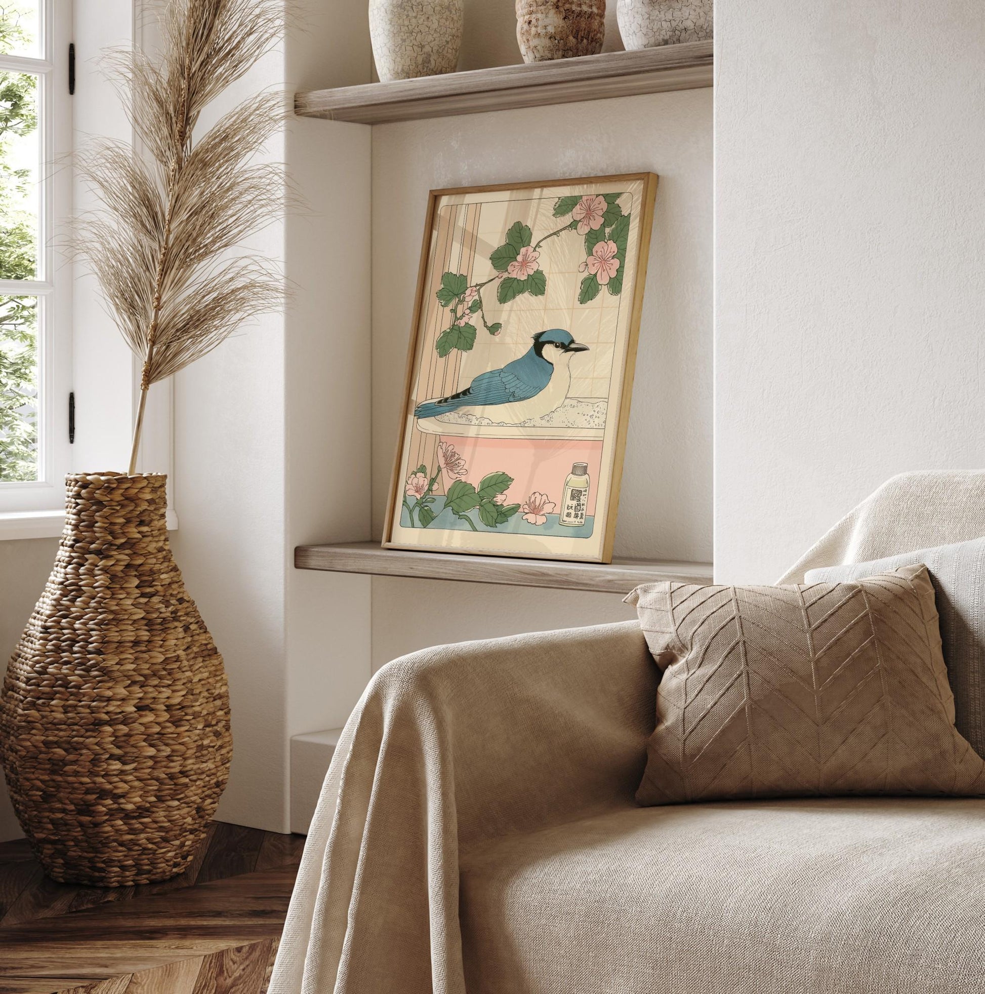 Blue Jay in Bathtub Print: Japanese Bathroom Art