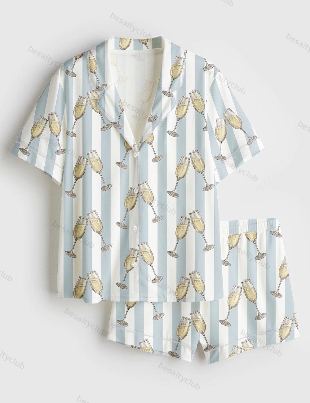 Blue Stripes Champagne Wine Lover Bachelorette Party Celebration Print Short Sleeve Satin Pajama Set
