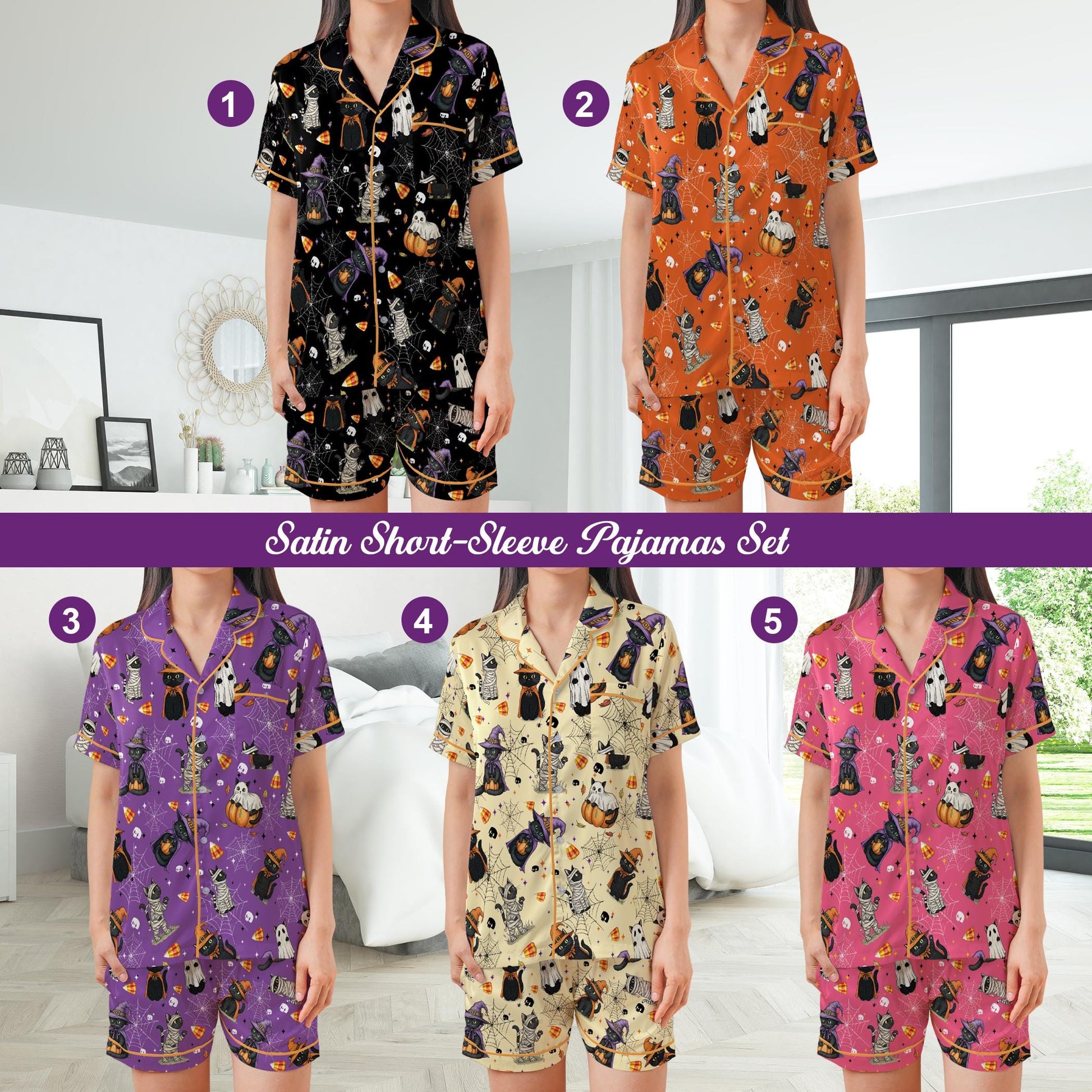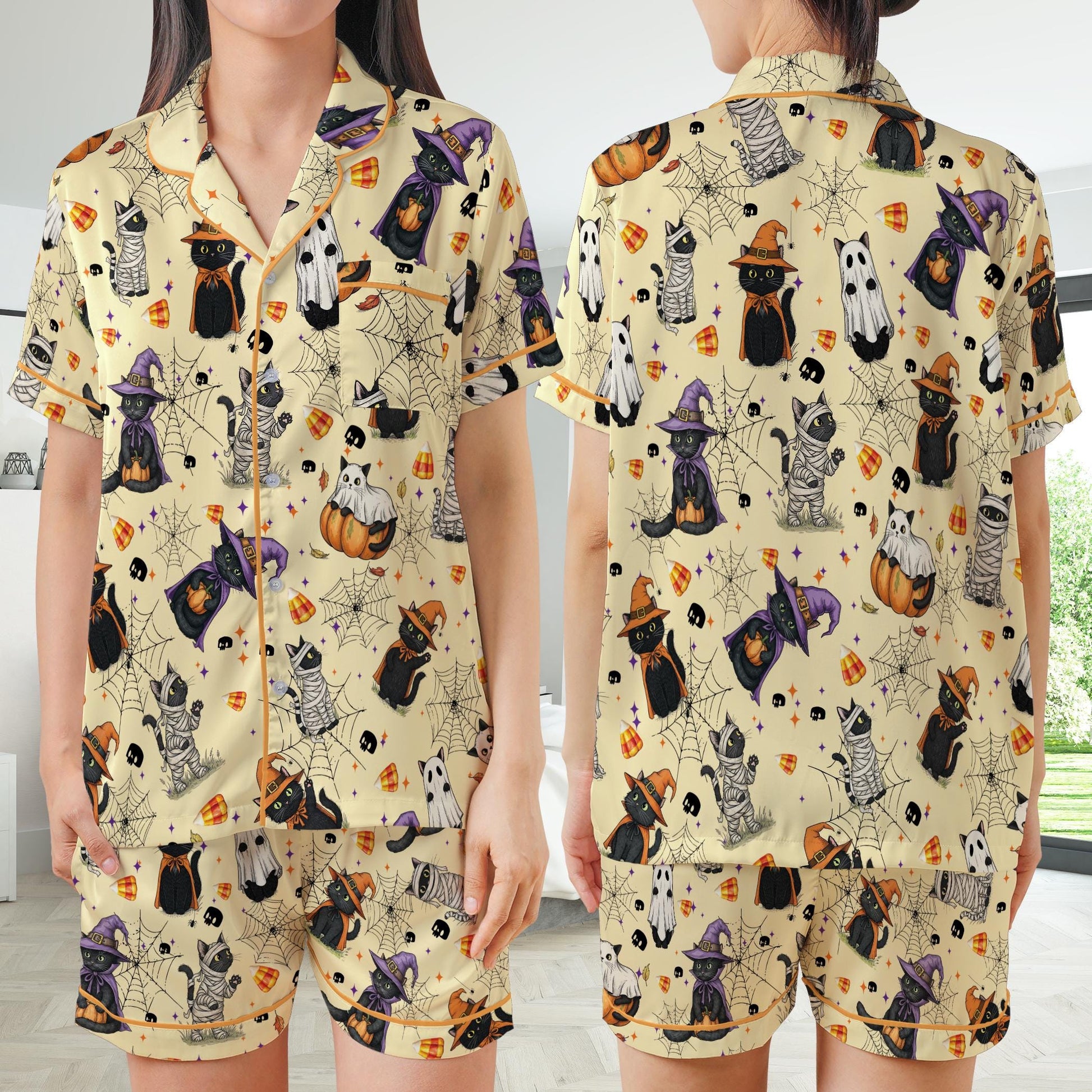 Boo Ghost Black Cat Halloween Satin Pajamas Set, Spooky Season Pajama Set, Funny Cat Lover Sleepwear, Cat Mama Halloween Gift