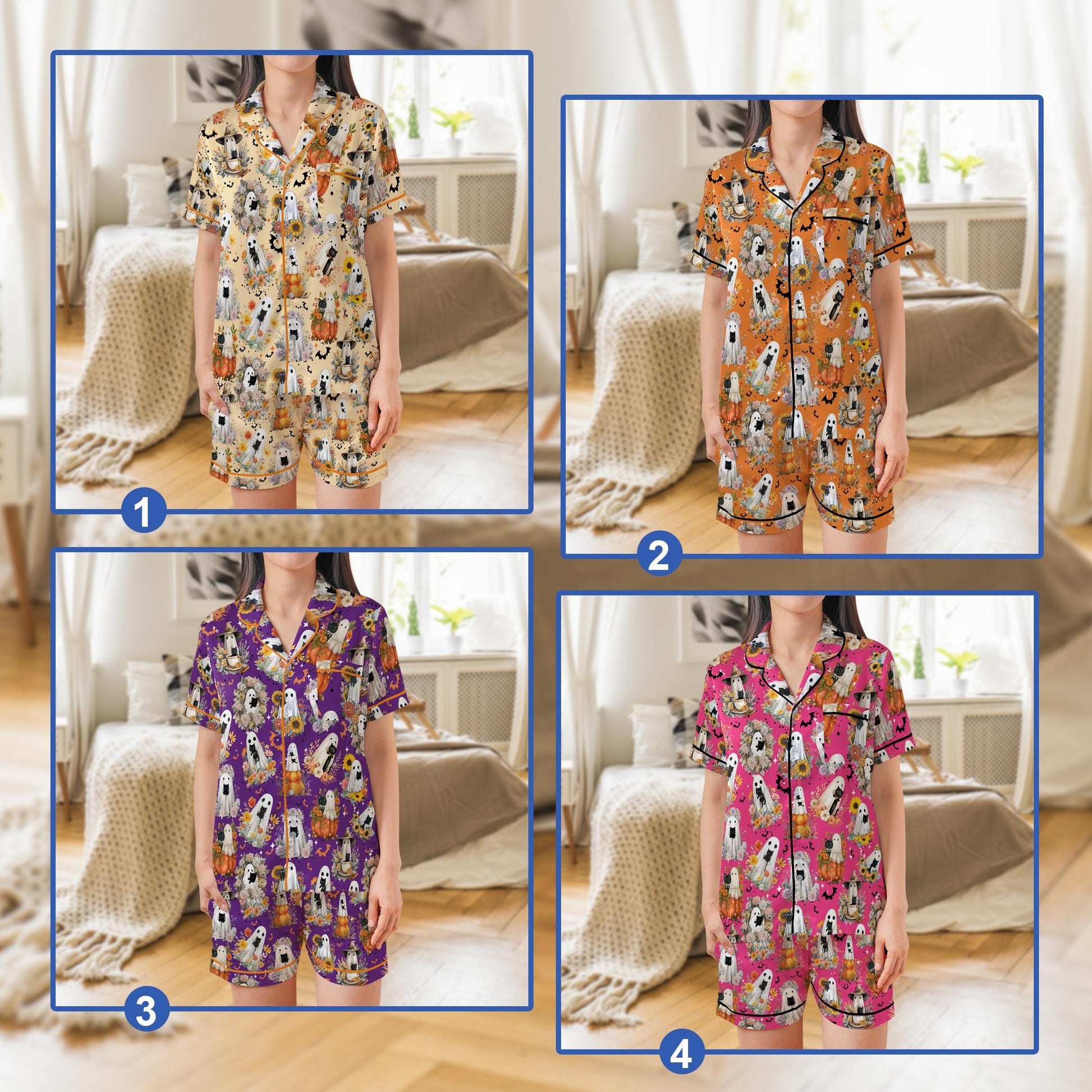 Boo Ghost Cat Halloween Satin Pajama Set, Cute Black Cat Spooky Season Pajamas, Fall Pumpkin Floral Halloween PJs, Cat Mom, Cat Lover Gift