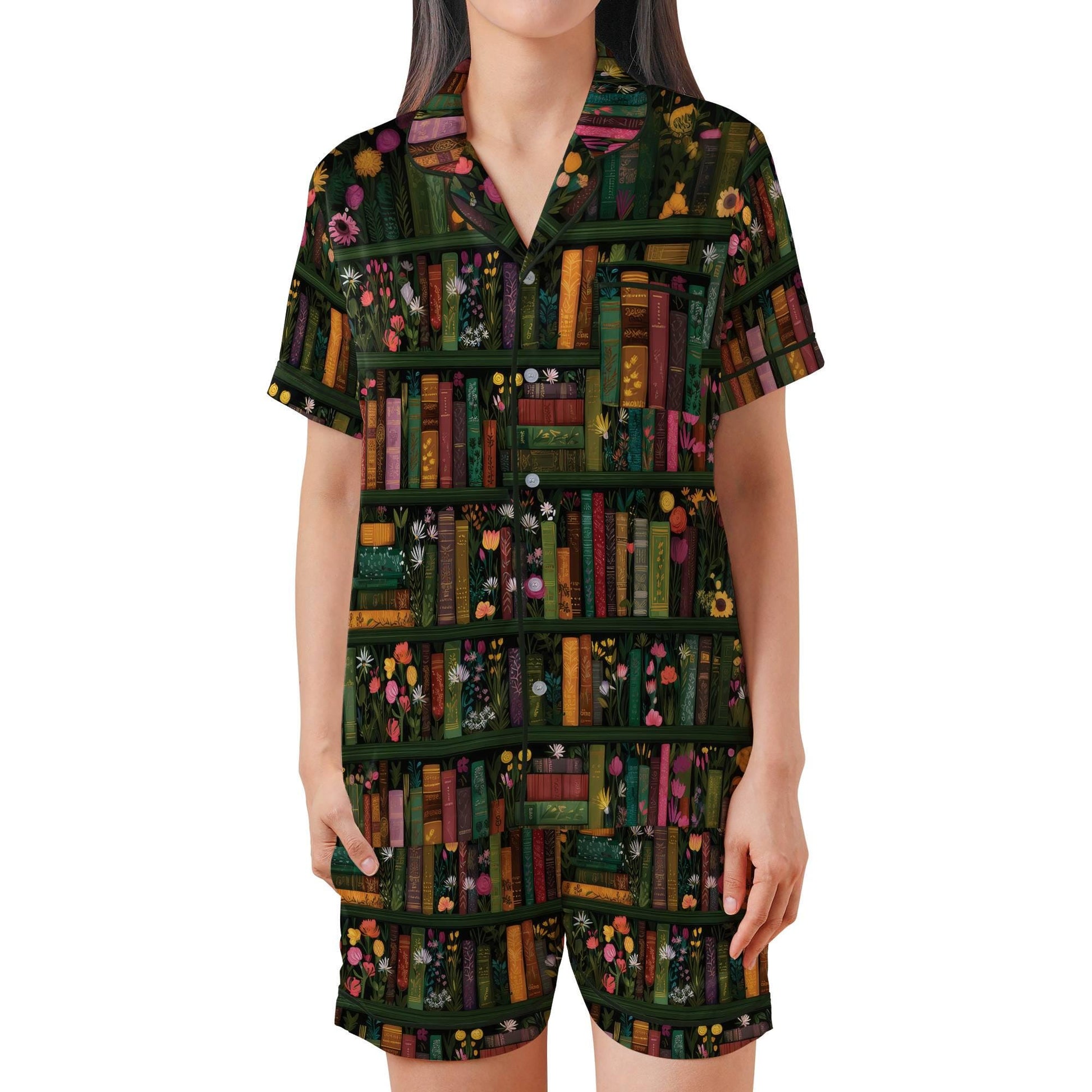 Book Short Sleeves Pajama Set, Book Lover Woman's Satin Pajama Reader Gift Pajamas Short Sleeve Shorts