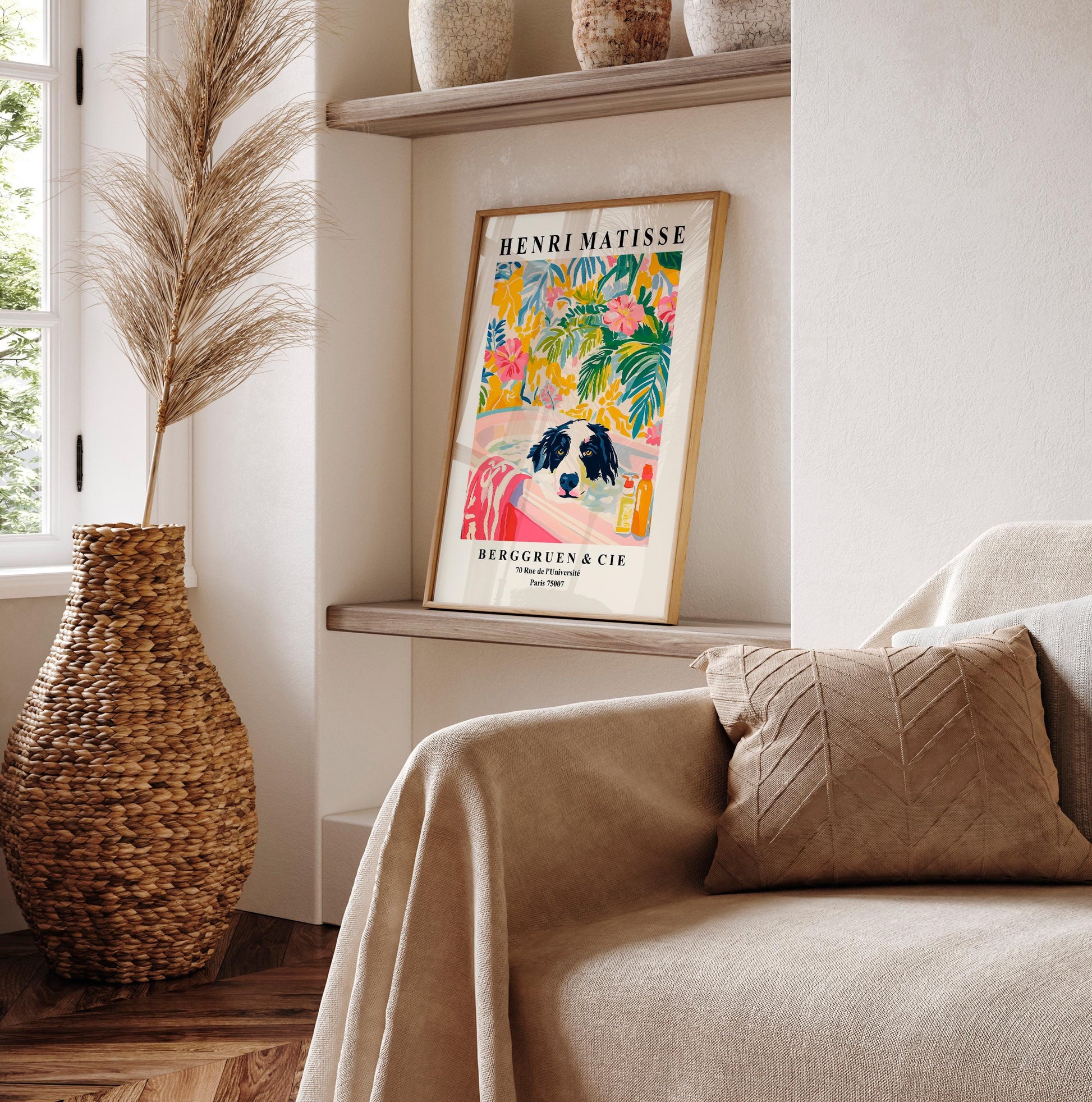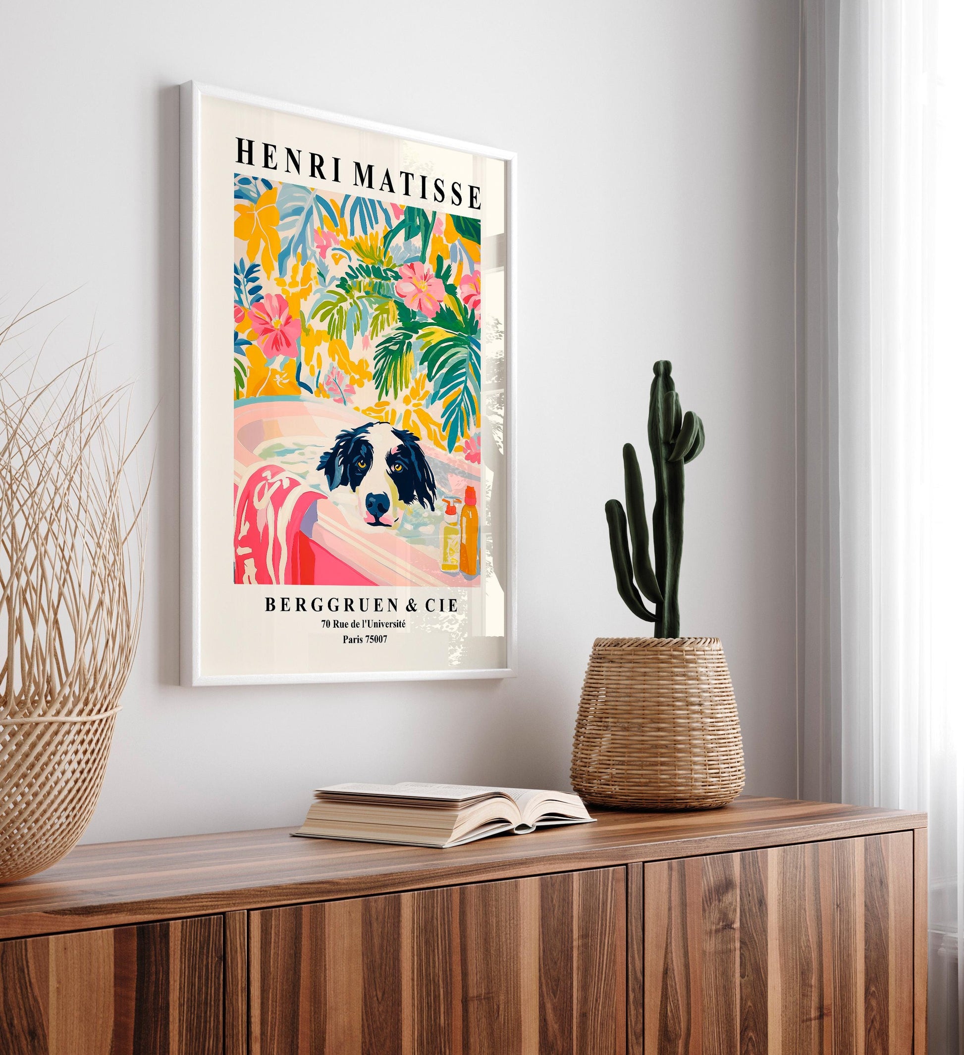Border Collie Bathroom Art Print: Funny Dog in Tub, Pink Matisse Style