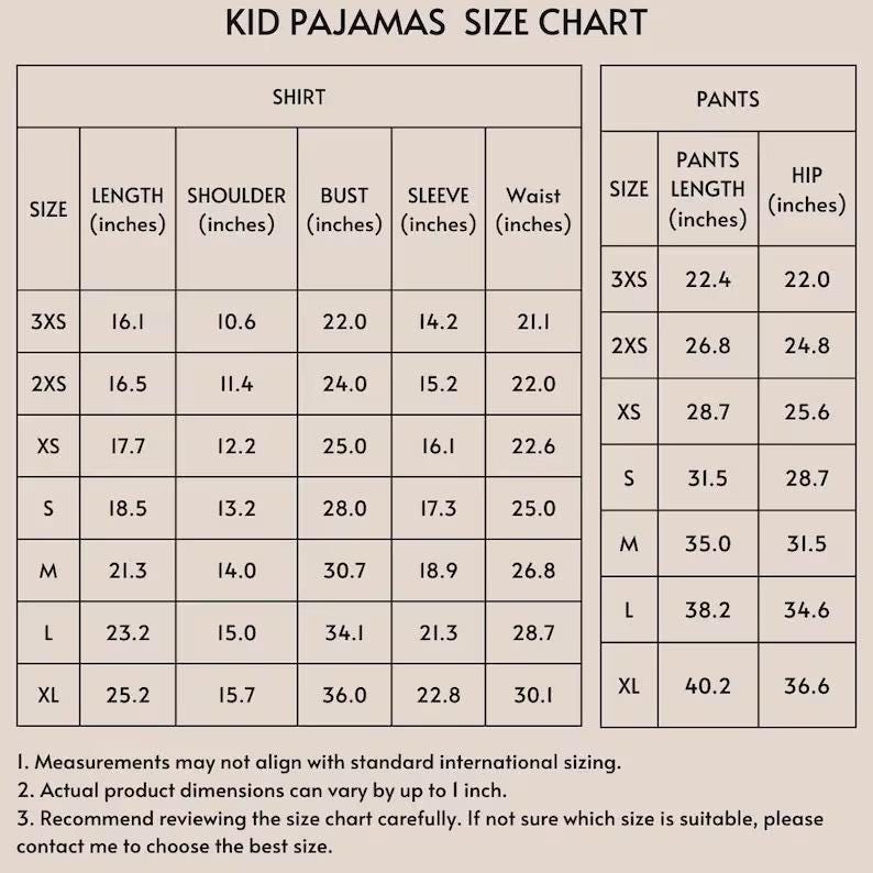 📌 Measurements are garment measurements. For a relaxed fit, compare with a similar PJ your child already wears.