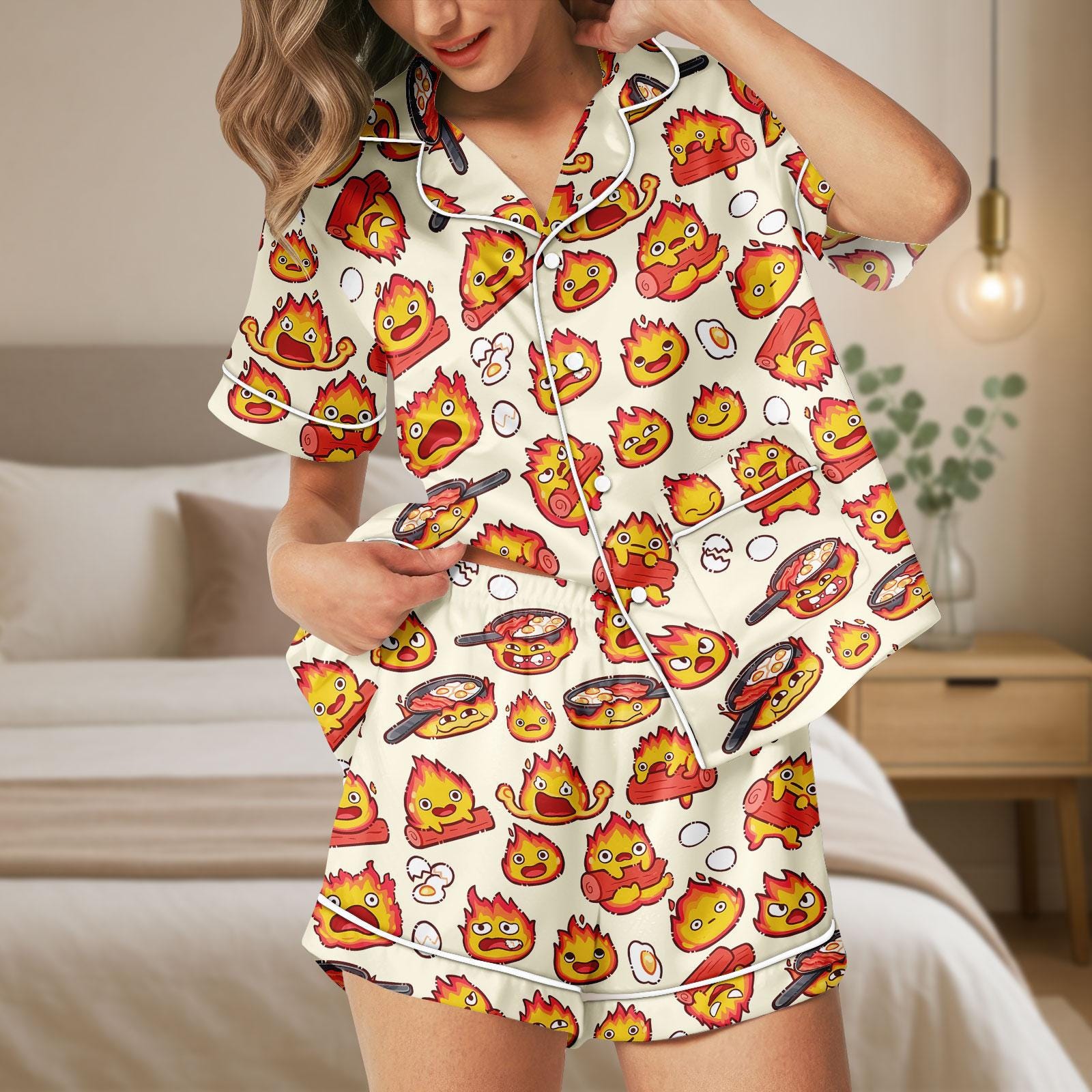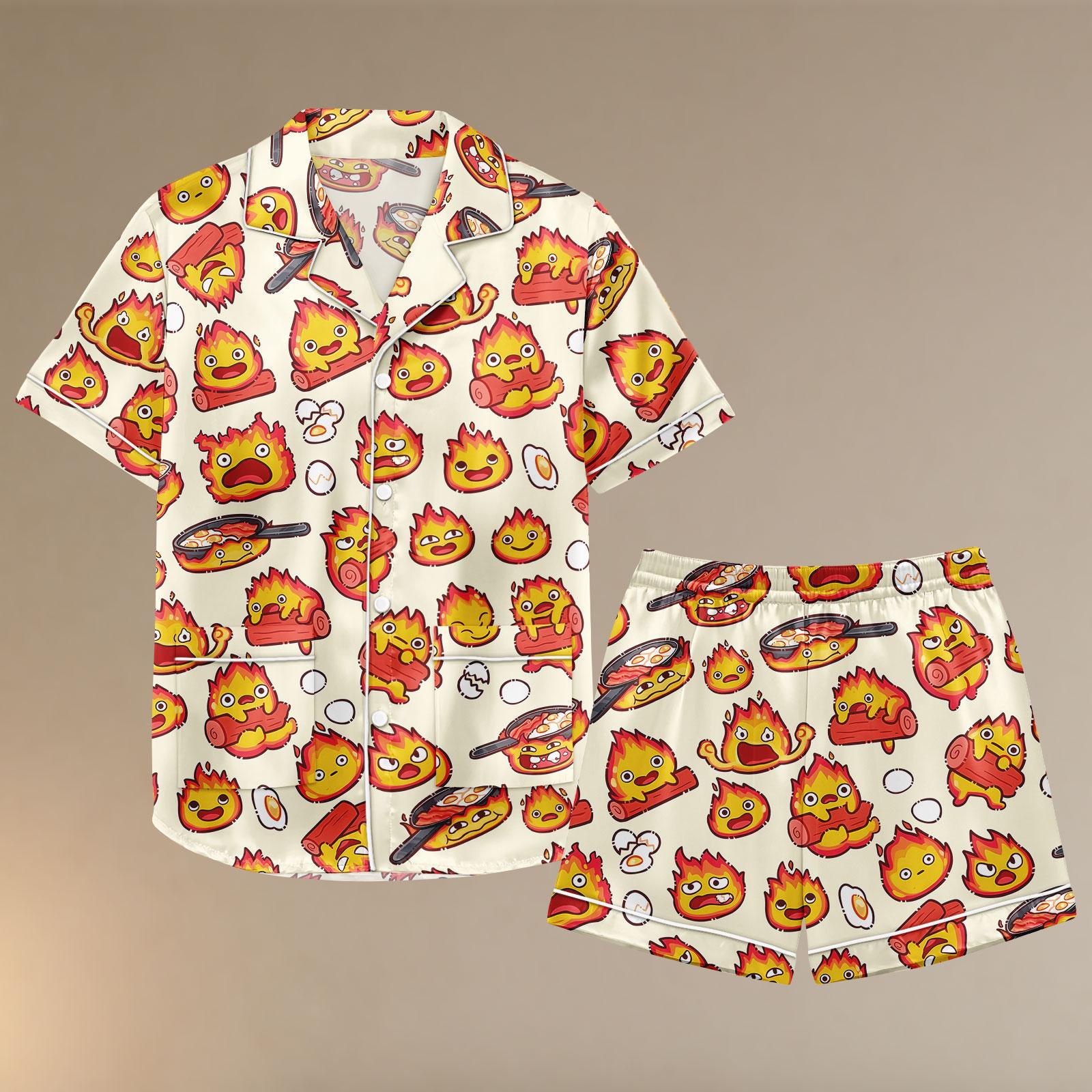 Calcifer Satin Pajama Set, Howl's Moving Castle Inspired Sleepwear, Kawaii Anime Fire Spirit Short PJs, Cute Ghibli Button Up Loungewear