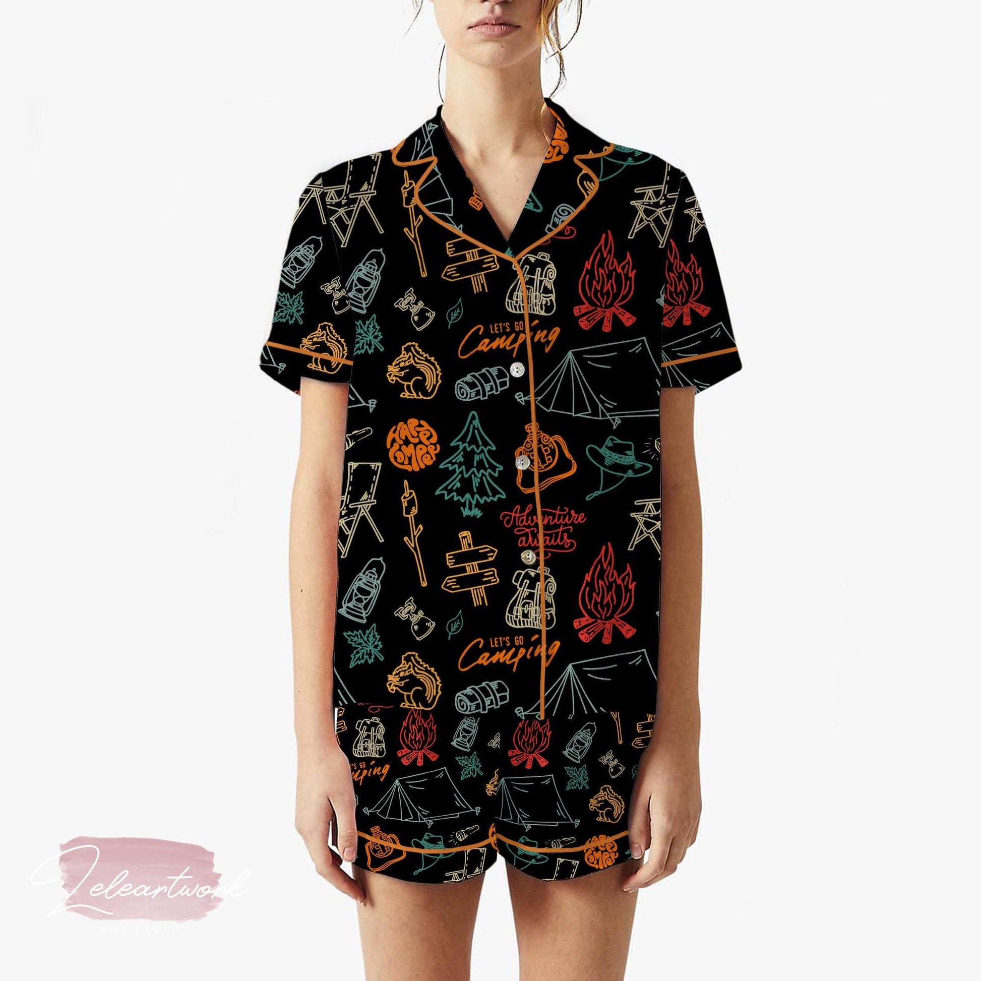 Camp Crew Pajama Set – Colorful Camping Print Short Sleeve Sleepwear, Fun Outdoor Adventure Loungewear Gift