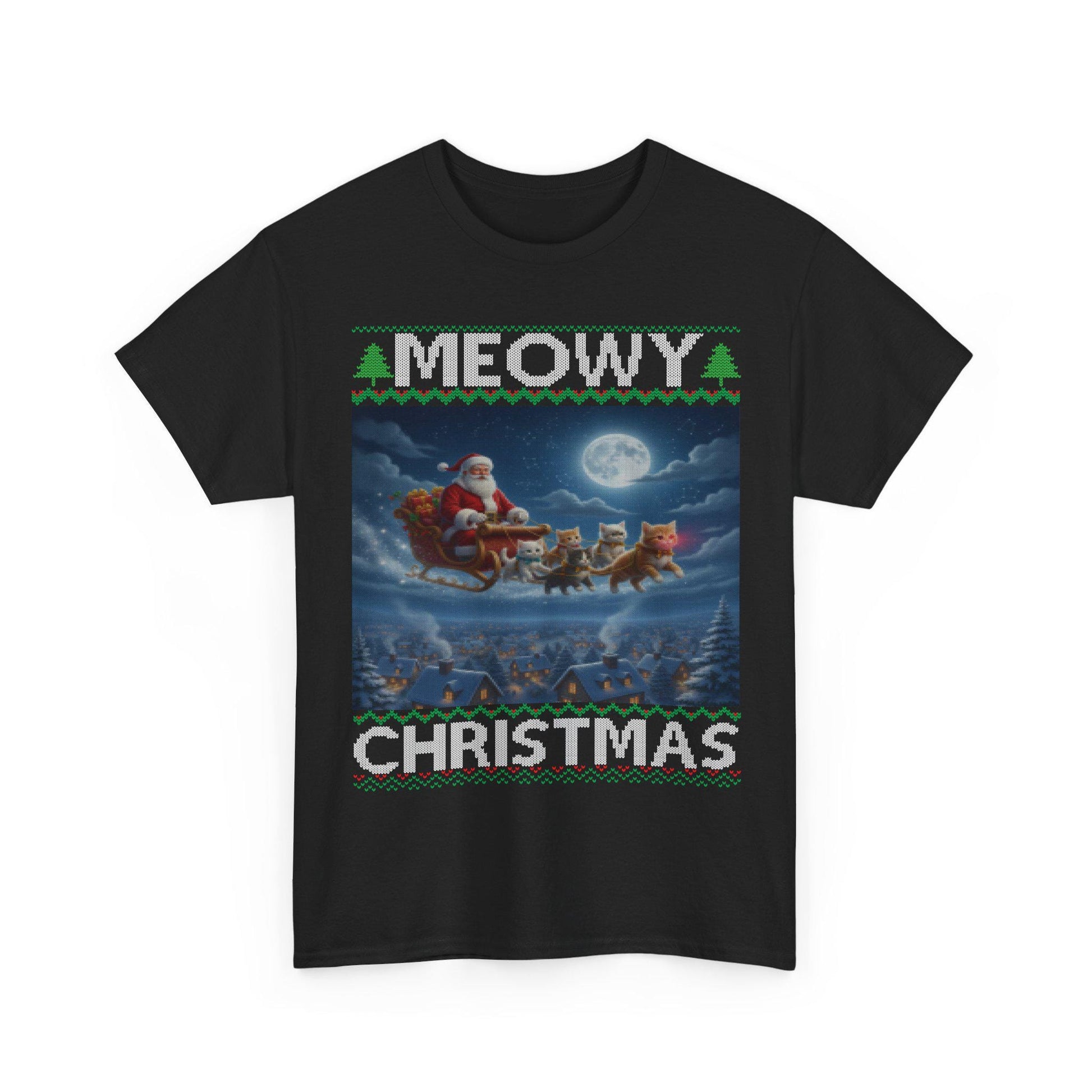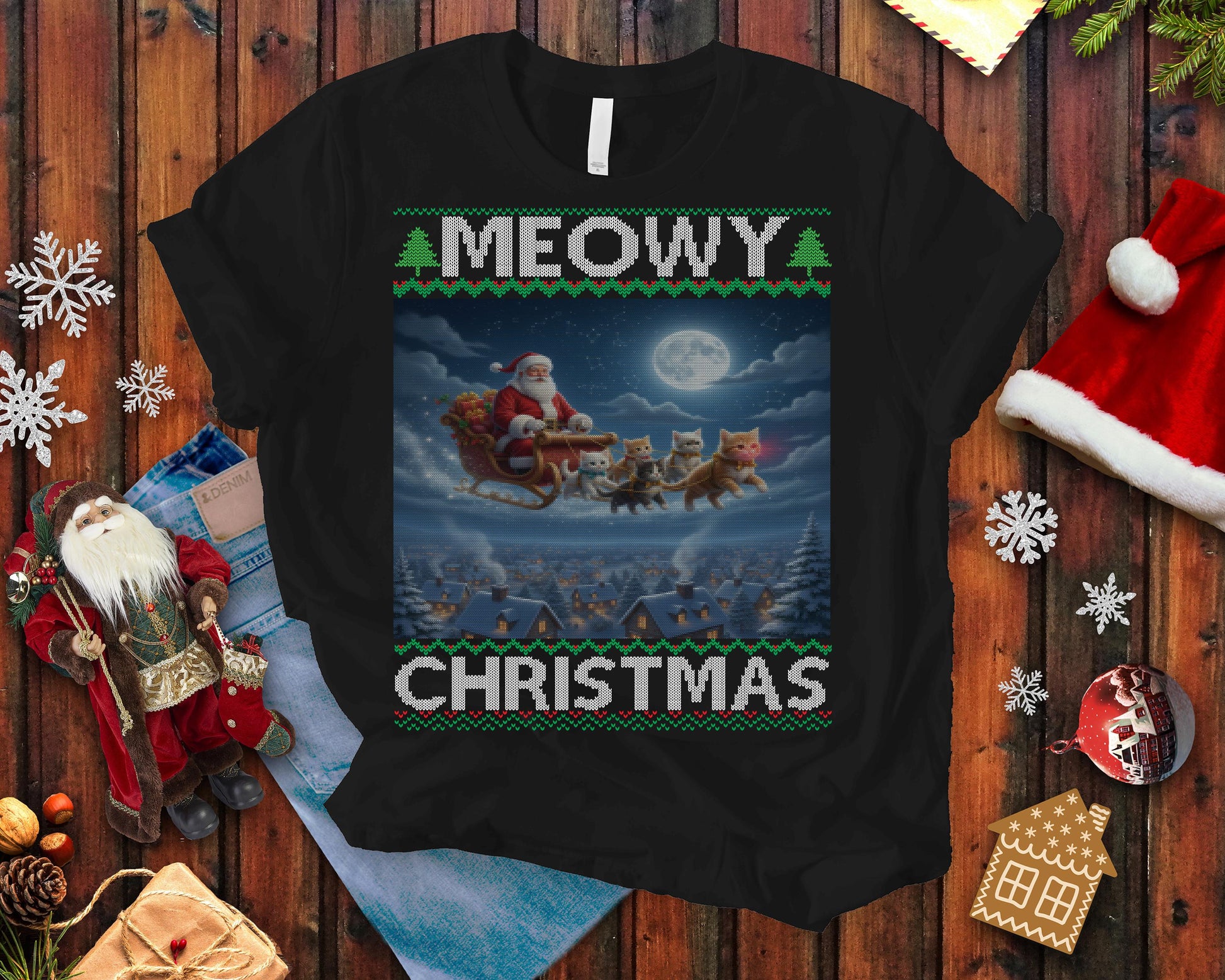 Cat Themed Ugly Christmas Style T-shirt 100% Cotton ; Kittens Flying Santa Sleigh