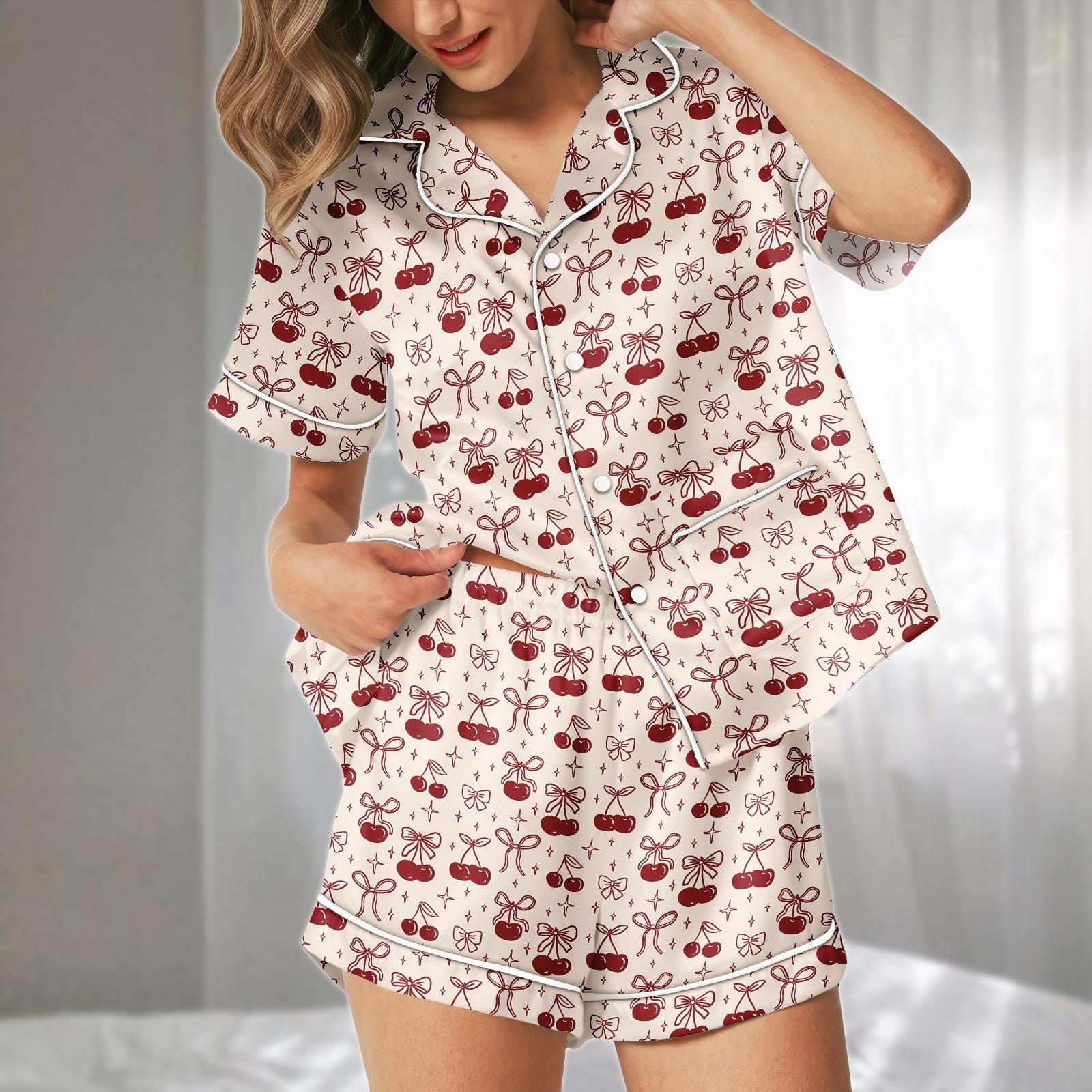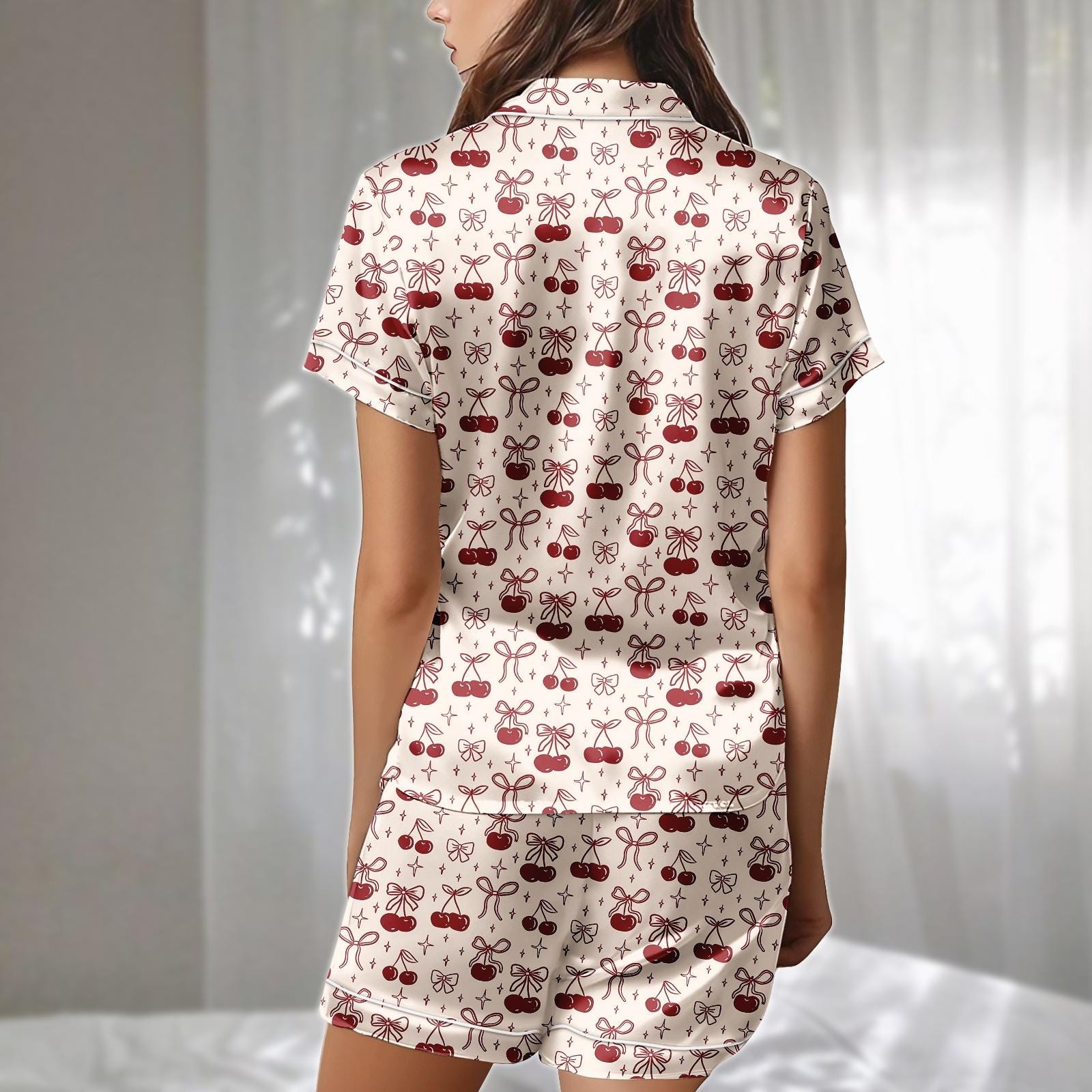 Cherry Bow Satin Pajamas Short Set, Red Fruit And Ribbon Sleepwear, Coquette Aesthetic Loungewear, Cute Holiday Pajamas, Gift For Her
