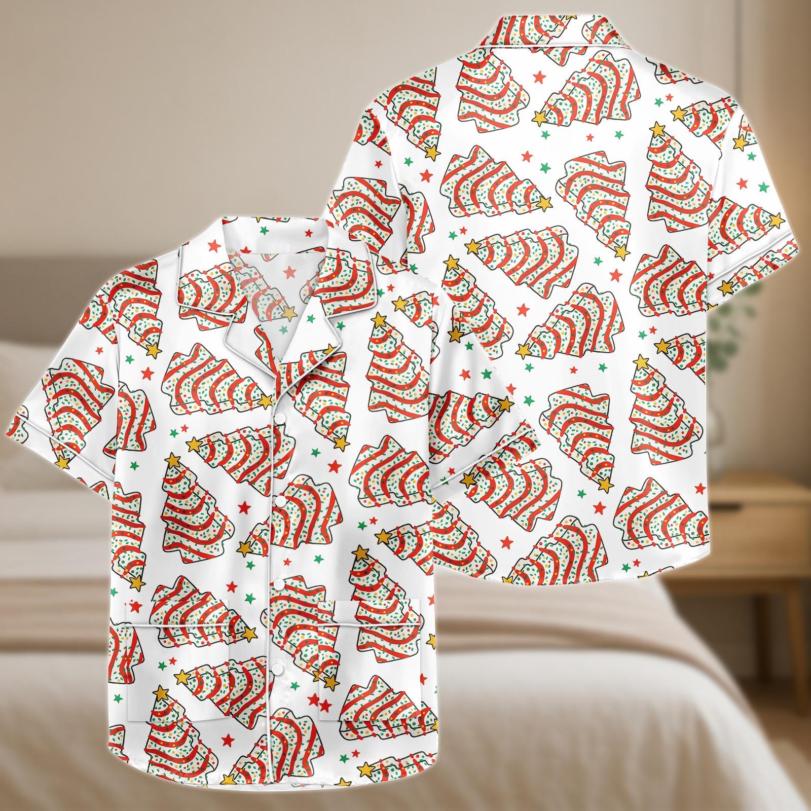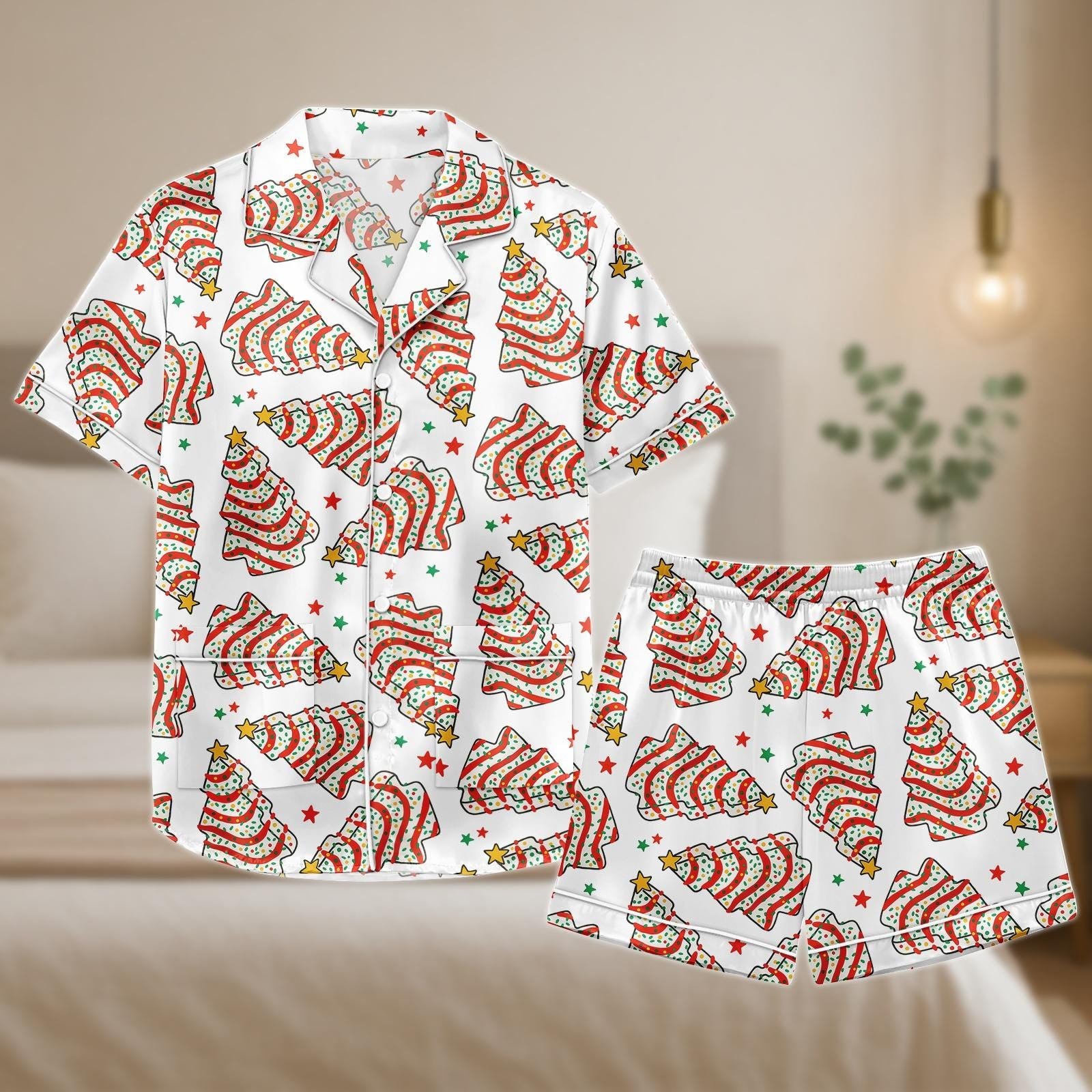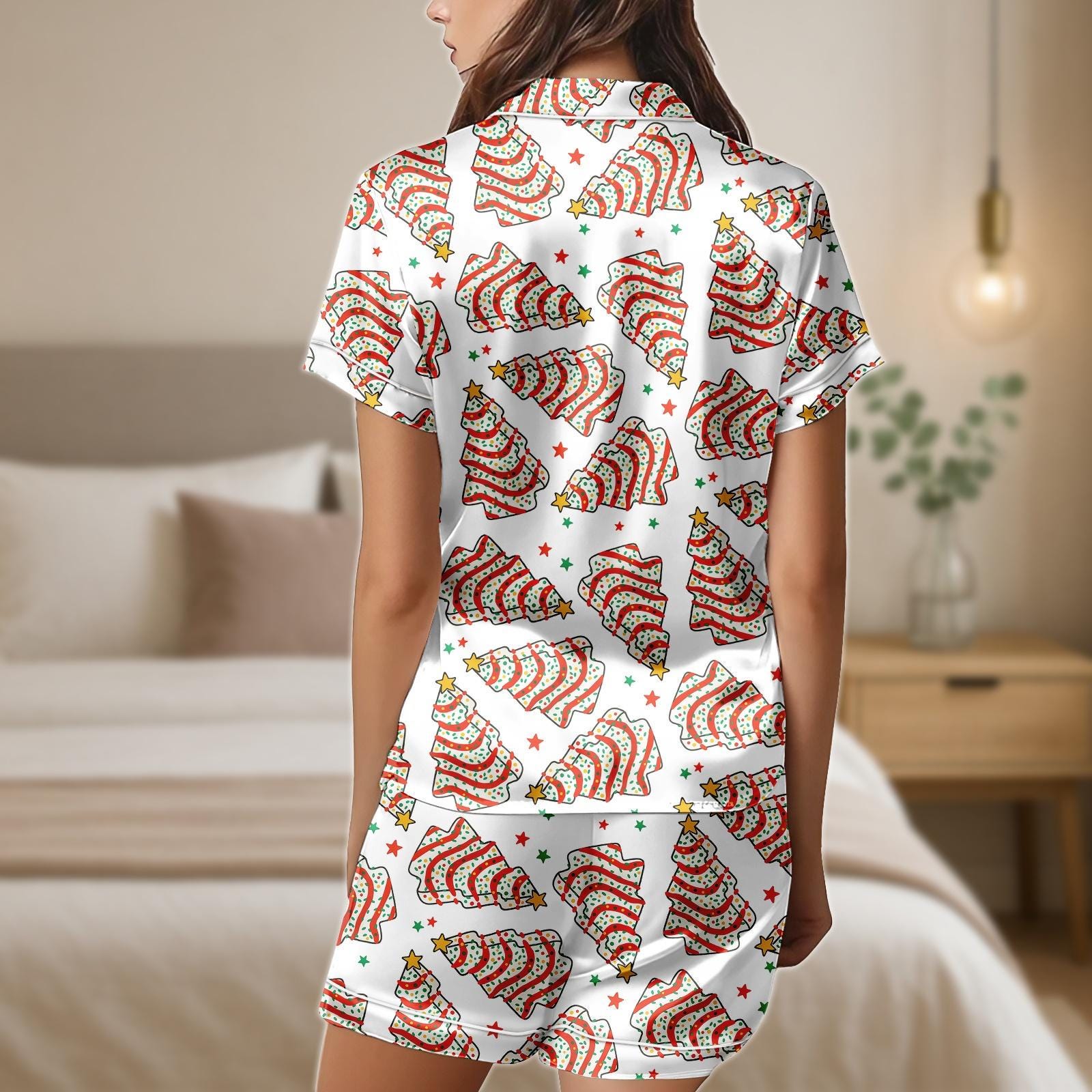 Christmas Tree Satin Pajama Set, Festive Holiday Short Sleeve PJs, Red Green Tree Print Sleepwear, Cute Christmas Shorts Set