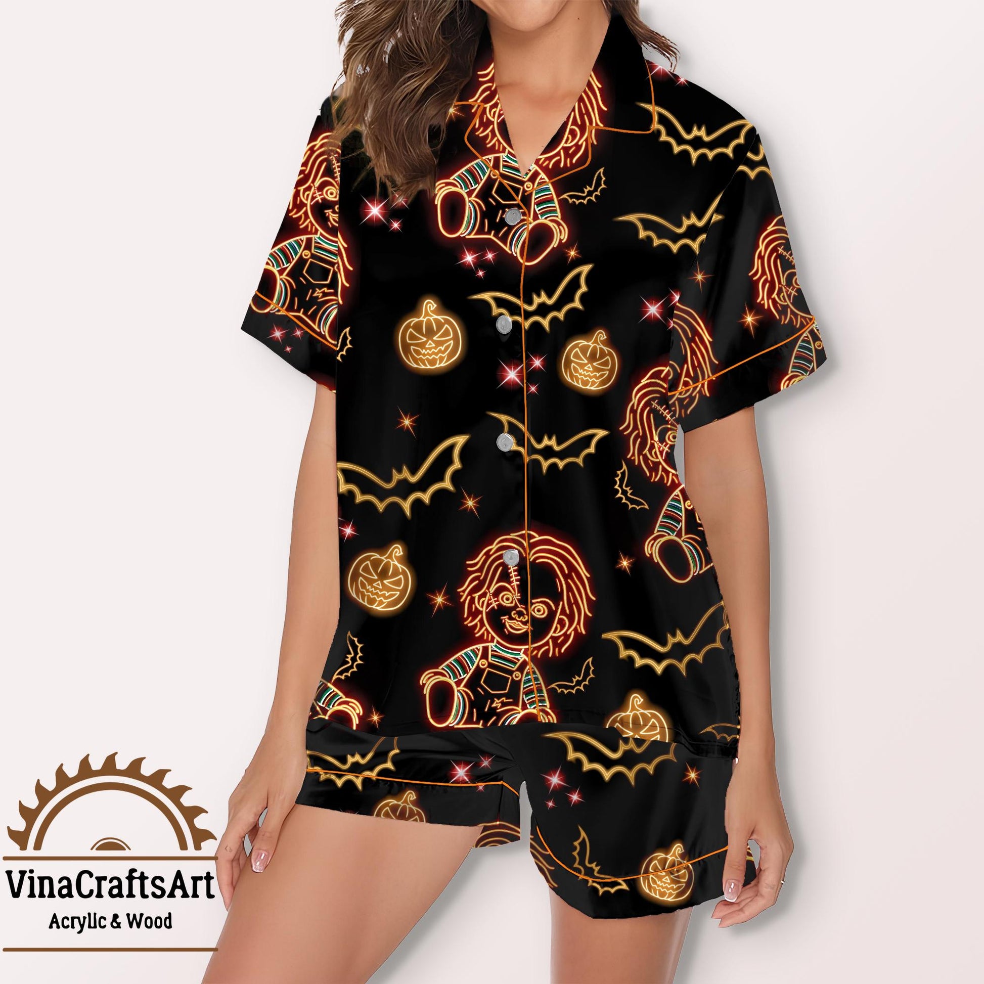 Chucky Neon Halloween Pajama Set | Cute Horror Doll Sleepwear | Women’s Spooky PJs with Pumpkins & Bats | Scary Movie Gift
