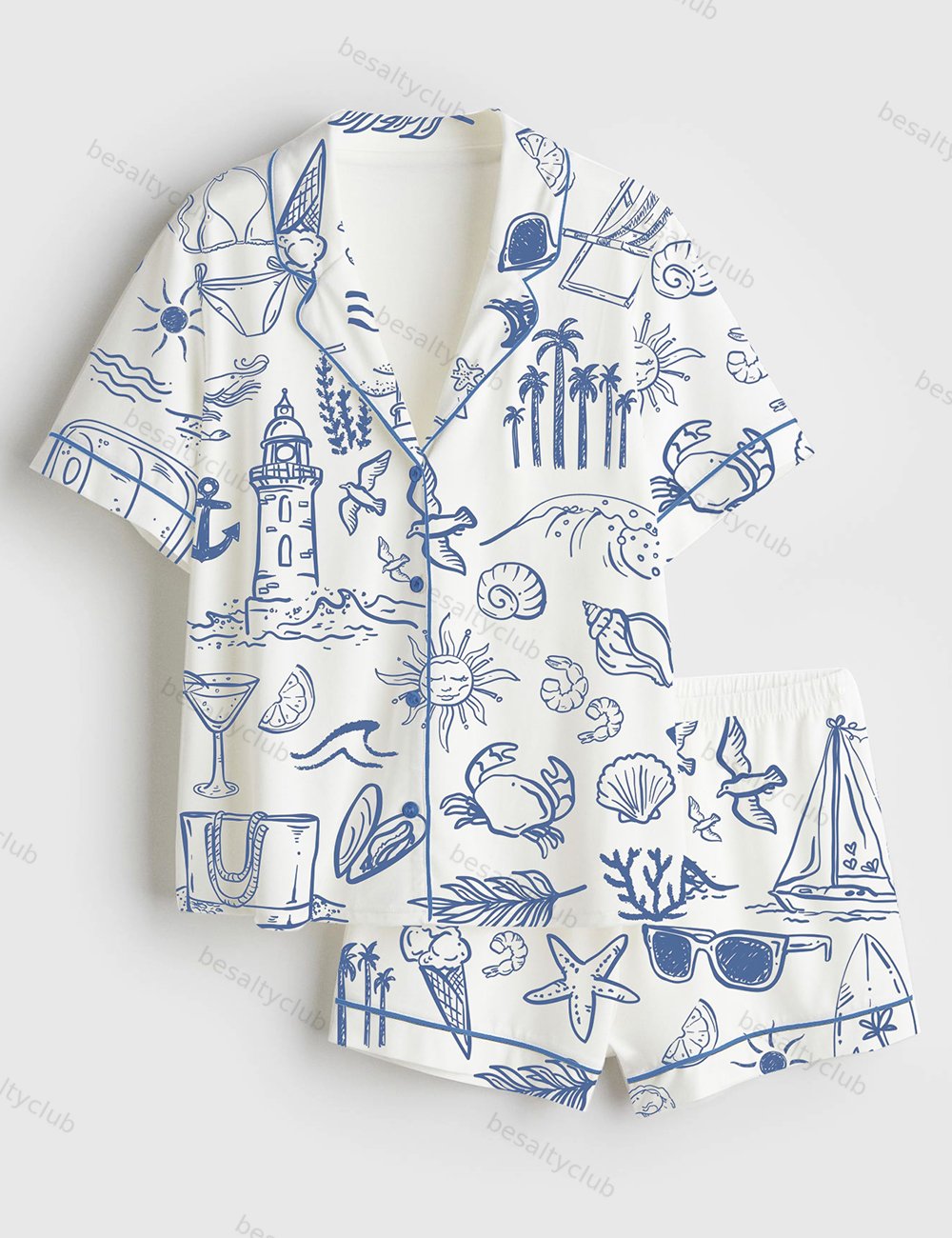 Coastal Whimsical Style Summer Beach Short Sleeve Satin Pajama Set