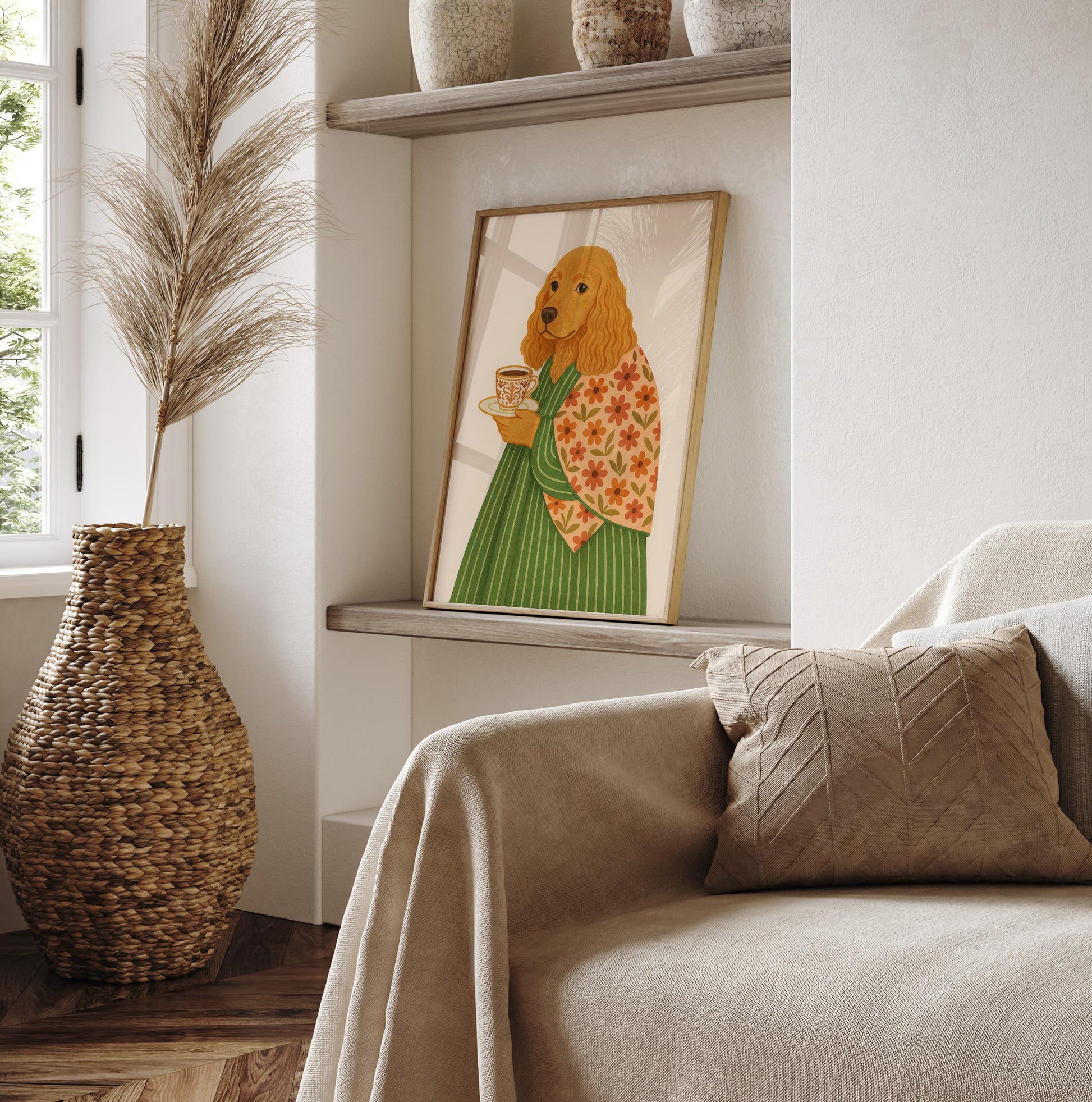Cocker Spaniel print, Dog with coffee, Coffee wall art, Espresso art print, Floral pattern print, Beige neutral aesthetic poster, Dog art