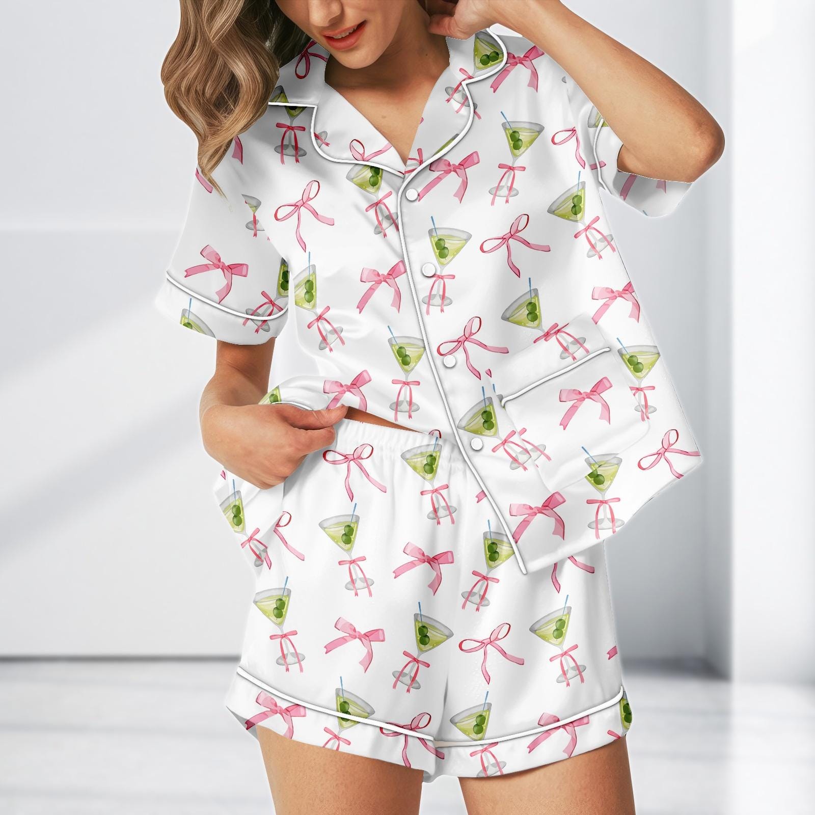 Cocktail Bow Satin Pajama Short, Pink Ribbon Loungewear, Cute Girly Party Summer Sleepwear Gift, Cocktail Satin Women Pjs