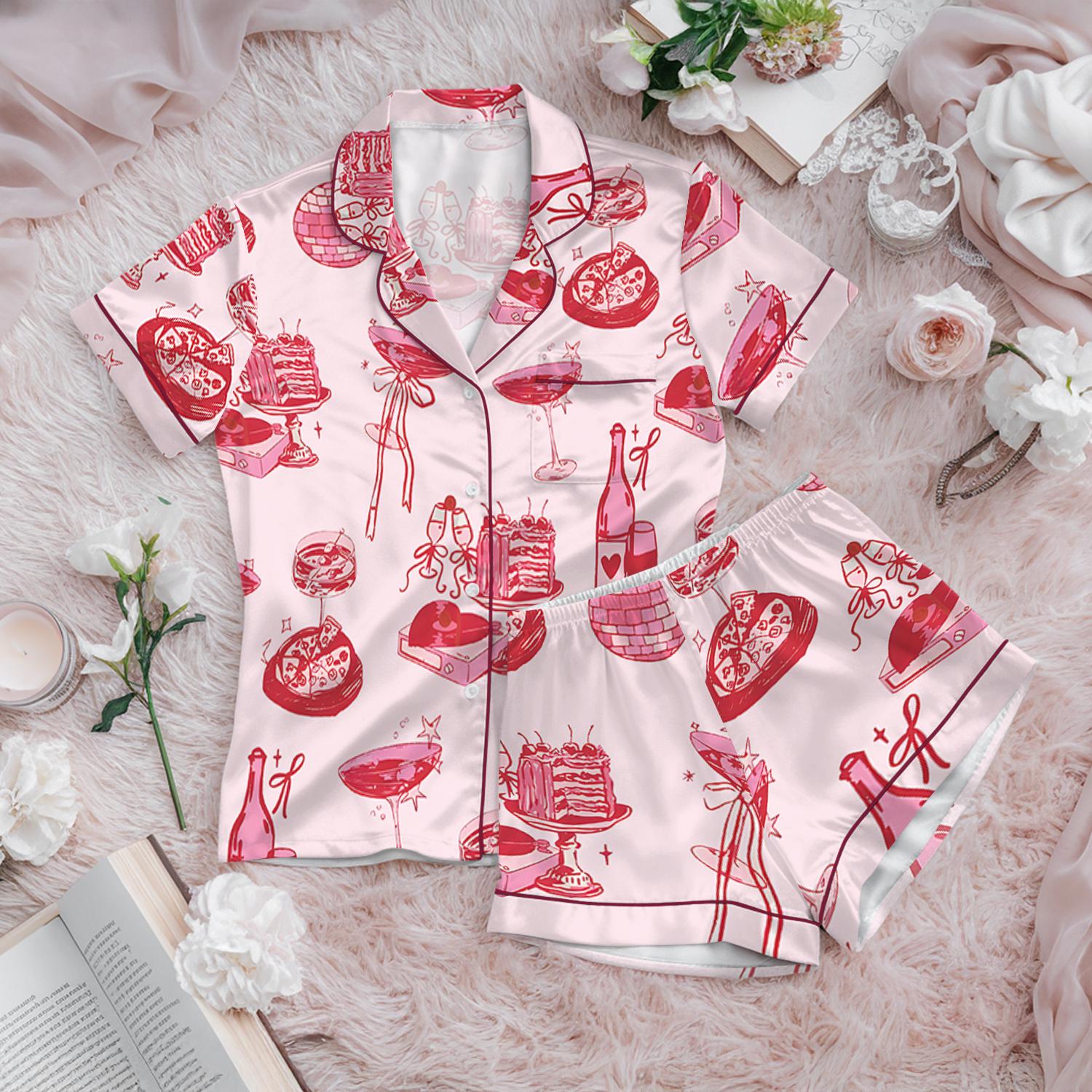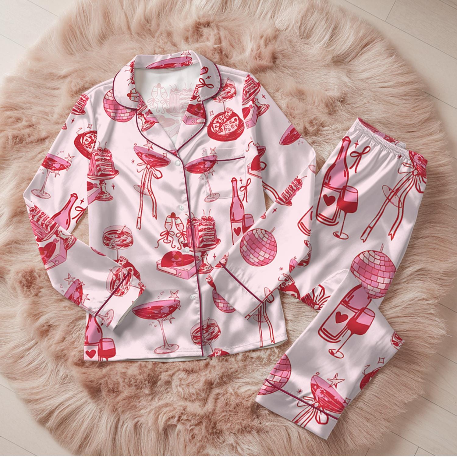 Cocktail Girl Social Club Satin Pajama Set, Retro Disco Ball Margarita Pjs, Cocktail Bow Loungewear, Cute Girly Party Pjs