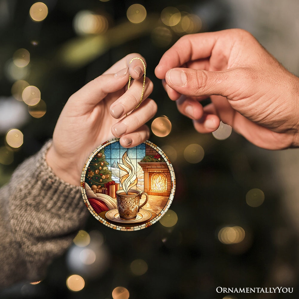 Coffee Illustration Stained Glass Style Ceramic Ornament, Christmas Gift and Decor
