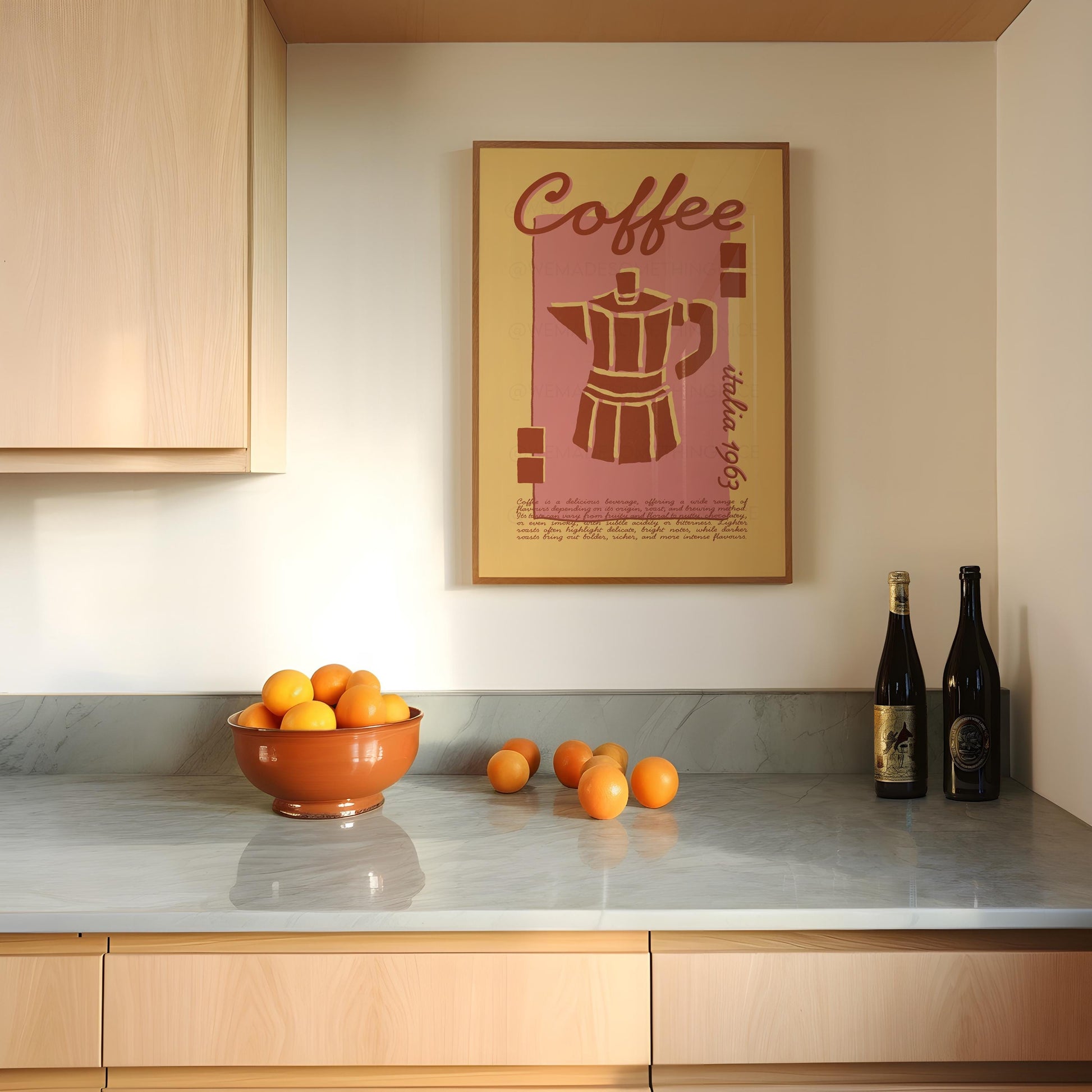 Coffee Poster, Kitchen Art, Kitchen Poster, Kitchen Print, Moka Pot, Modern Kitchen Decor, Retro Poster, Exhibition Poster, Pink Wall Art
