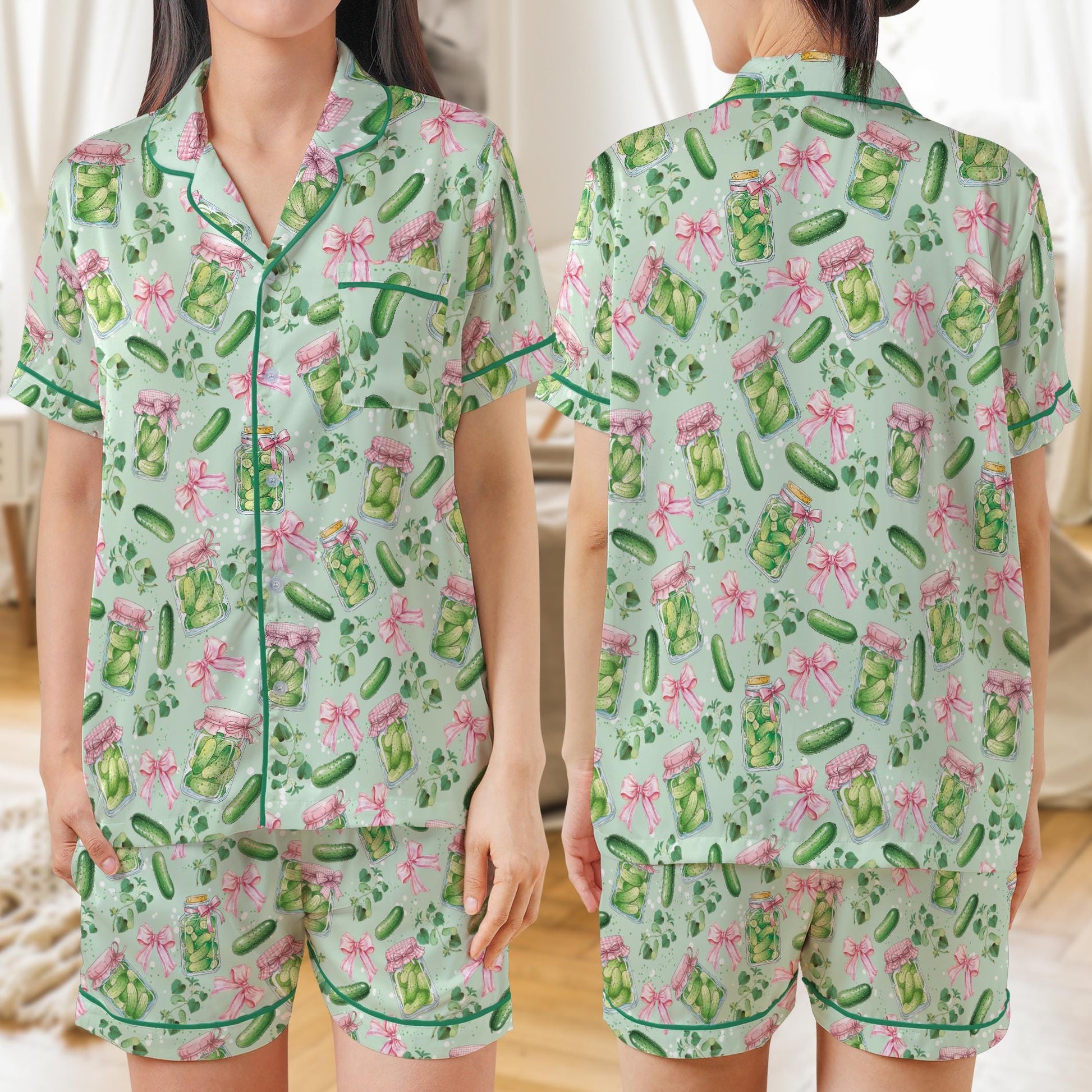 Coquette Pickle Satin Pajama Set, Preppy Pink Bow Sleepwear for Women, Pickle Lovers Pajamas, Summer Loungewear Set, Pickle Season Gifts