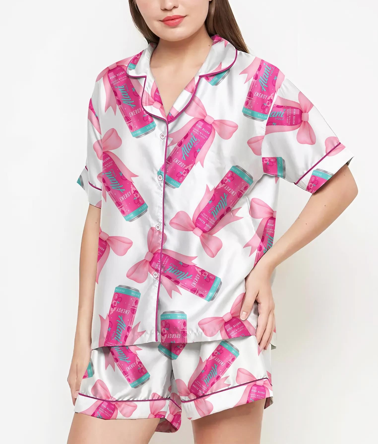 Coquette Pink Bow Alani Pajamas Satin Set, Energy Drink Shirt, Mother's Day Gift, Birthday Gift,Pjs For Women, Bridesmaid Gifts, Party Gift