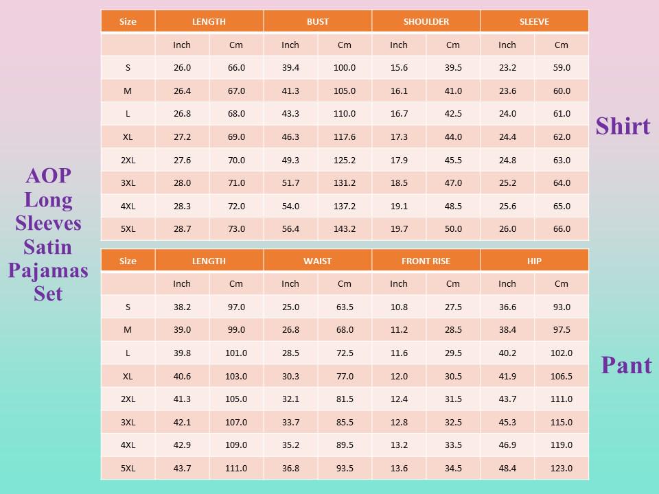 | 1/2 Chest (in/cm) | Length (in/cm) | Sleeve (in/cm) | Waist (in/cm) | Length (in/cm) | Inseam (in/cm) | |
