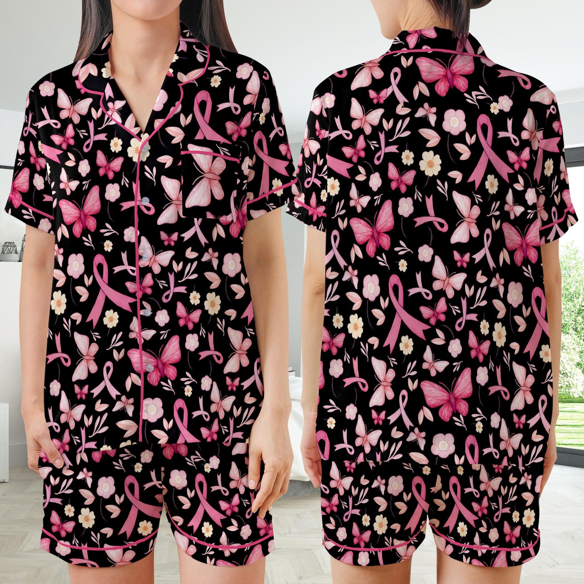Cute Breast Cancer Awareness Satin Pajamas, Wear Pink In October Pajama Set, Pink Ribbon Sleepwear, Breast Cancer Support Gift