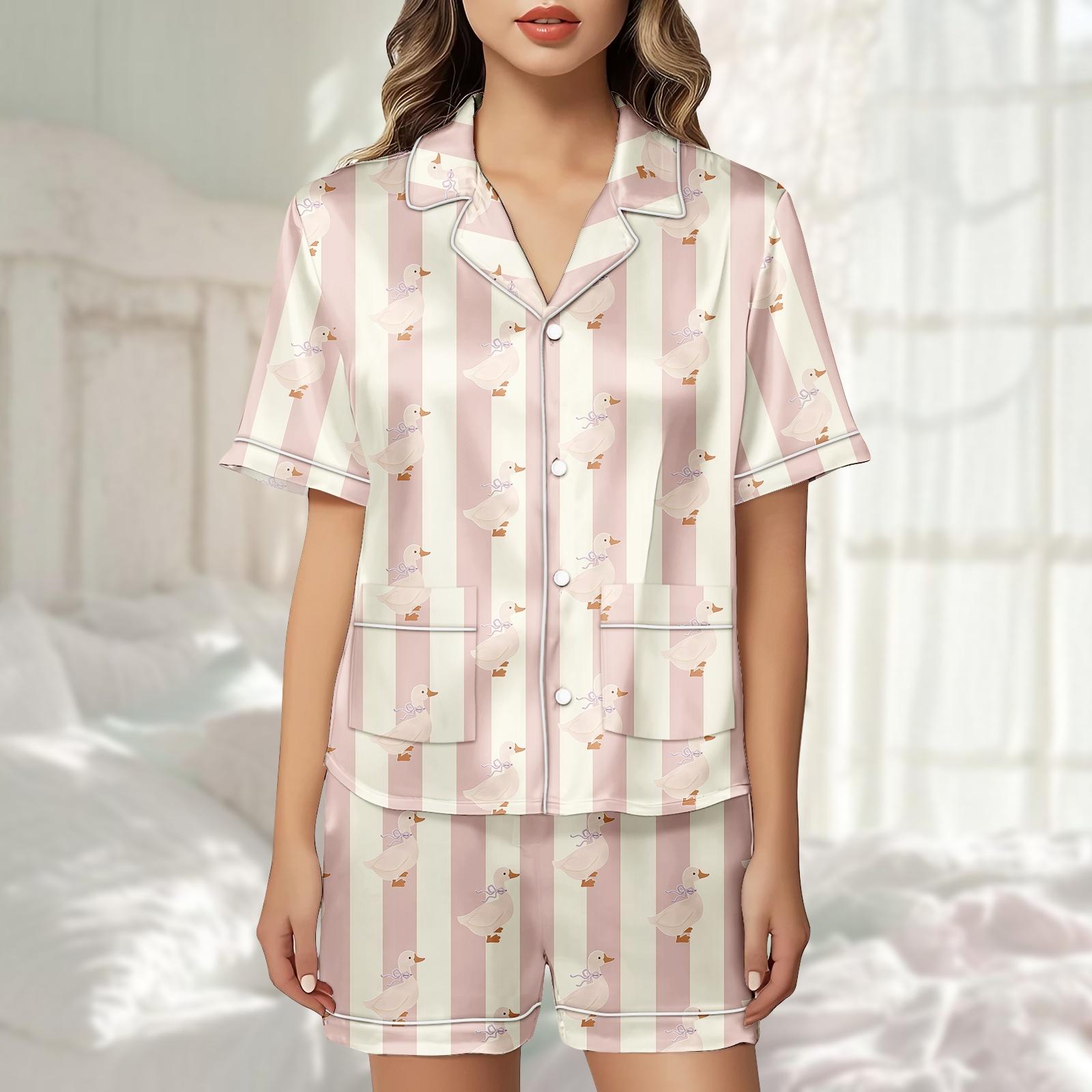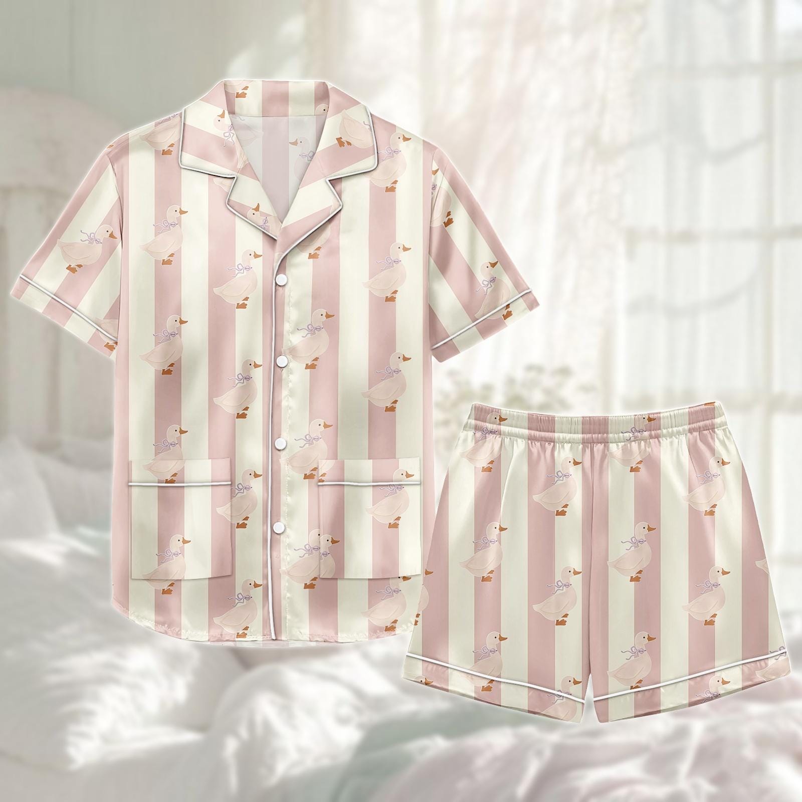 Cute Duck Satin Pajama Short Set, Pink Stripe Pjs For Women, Kawaii Loungewear, Summer Sleepwear, Pastel Aesthetic Pjs, Gift For Her