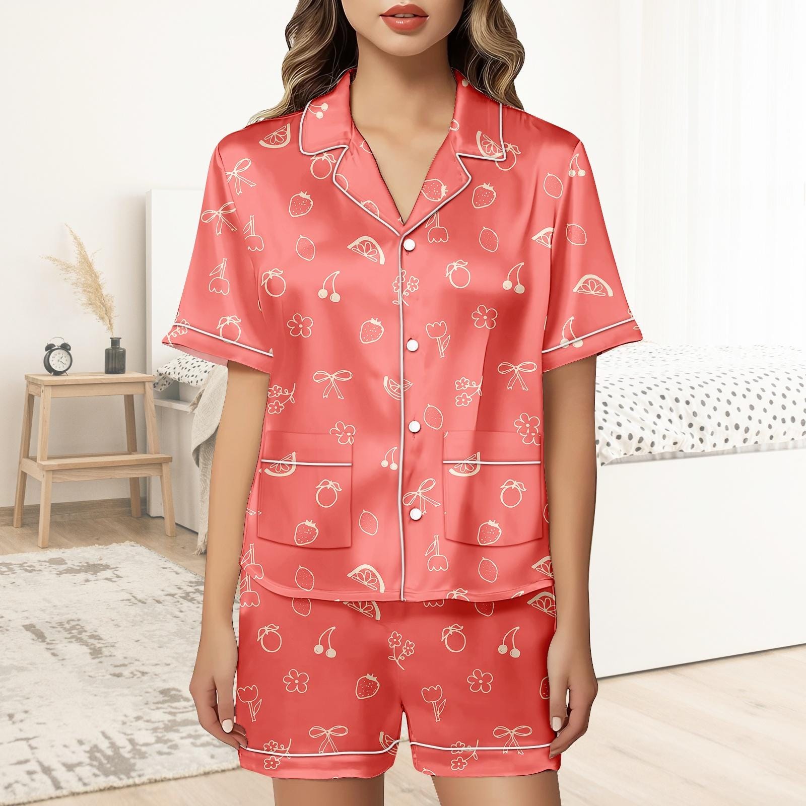 Cute Fruit Short Satin Pajamas, Retro Fruit Bridesmaid Pajamas Women, Pastel Pajama Set Women, Bridal Party Silk Pajamas For Her