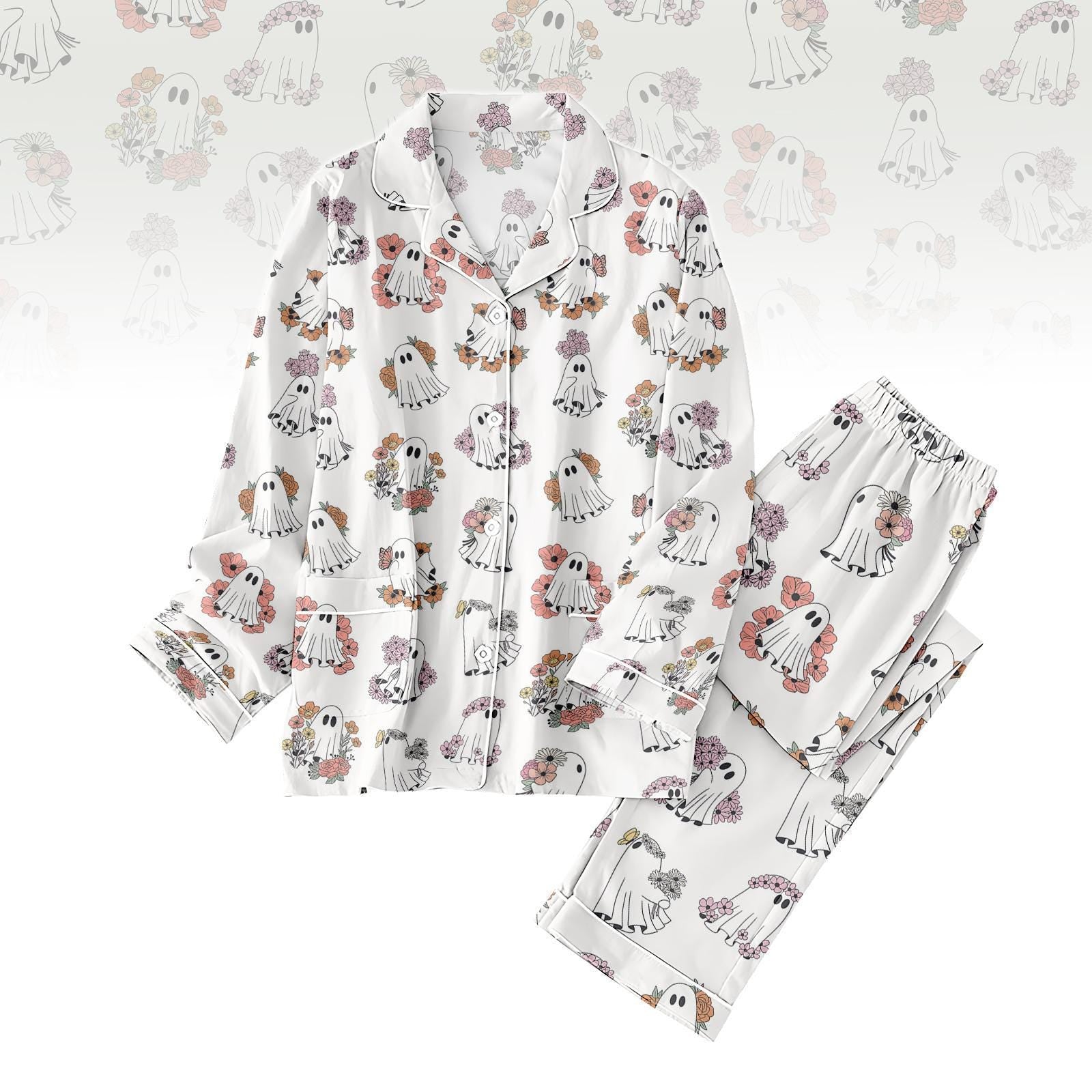 Cute Halloween Boo Floral Pajamas Set, Spooky Ghost Pajamas For Women, Halloween Season Pajamas Family, Cute Halloween Pajamas