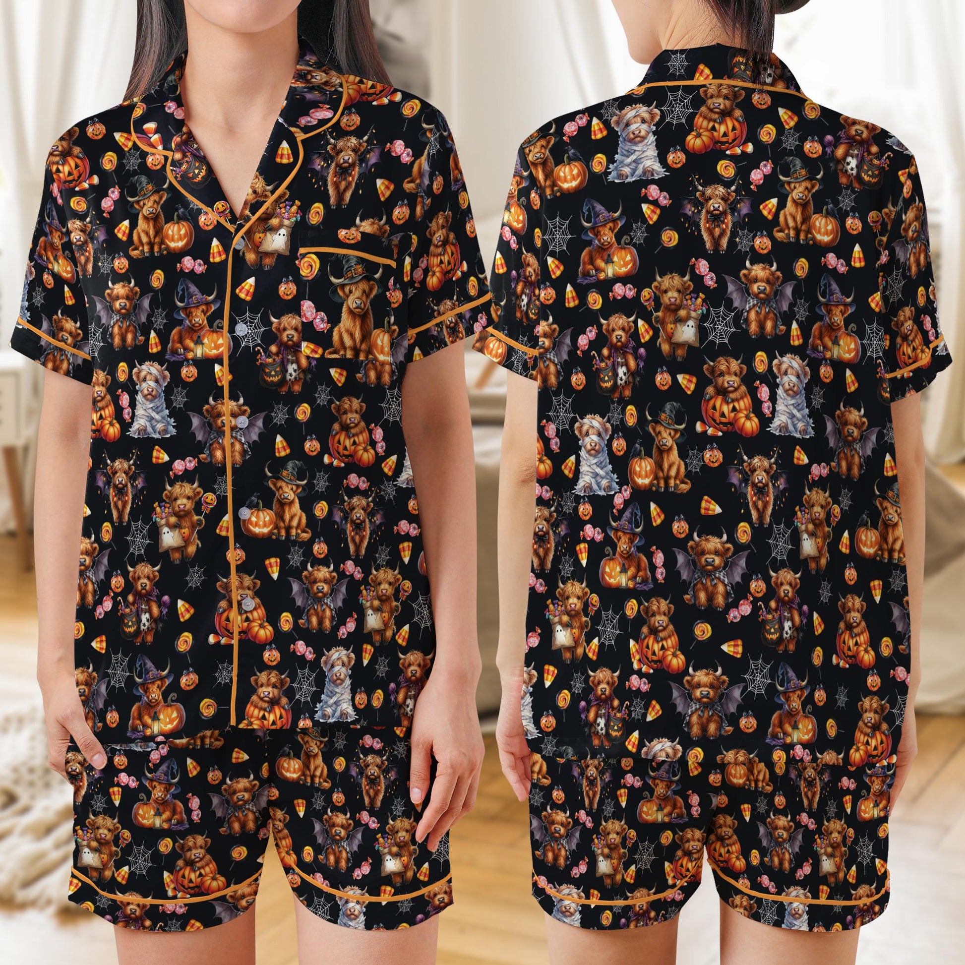 Cute Highland Cow Halloween Satin Pajama Set, Funny Mummy Witch Vampire Cow PJs, Spooky Farm Animal Fall Sleepwear, Moo I Mean Boo Pajamas