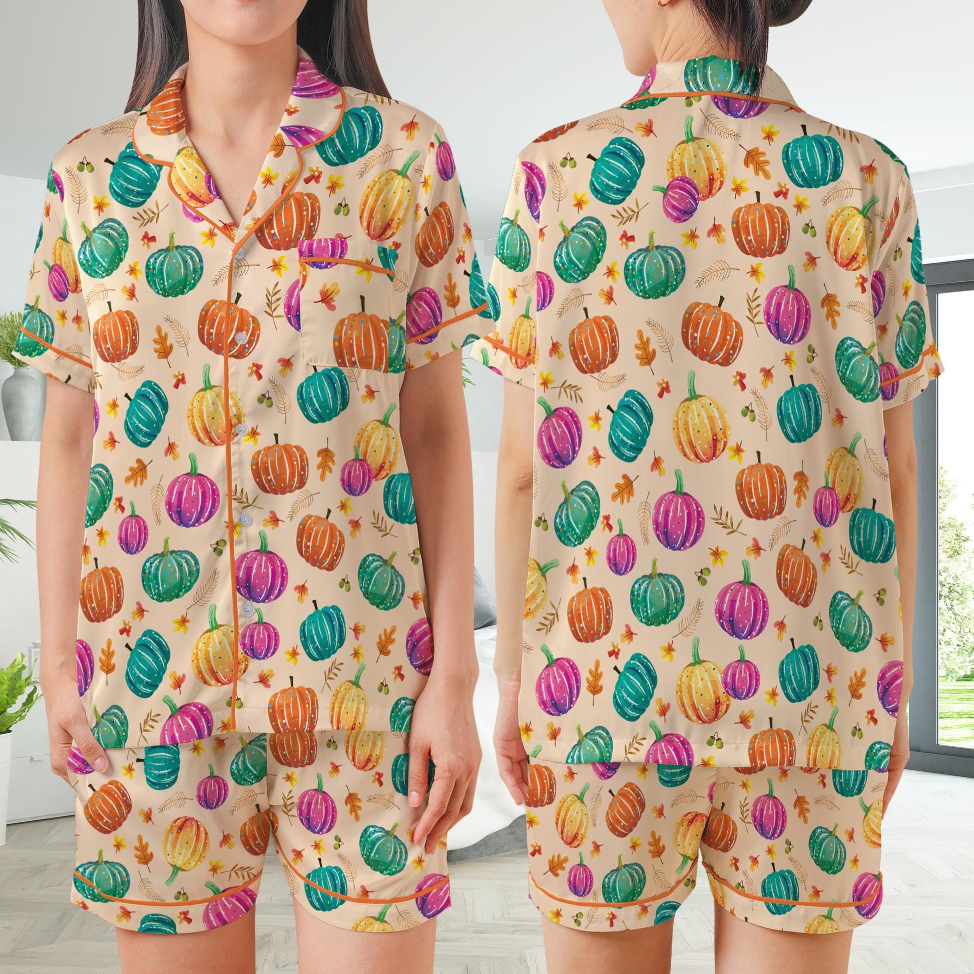 Cute Preppy Pumpkin Pajamas Set, Fall Pumpkin Pajama Sleepwear Short Long Sleeve Pajama Set, Retro Fall Vibes Home Wear, Pumpkin Season Set