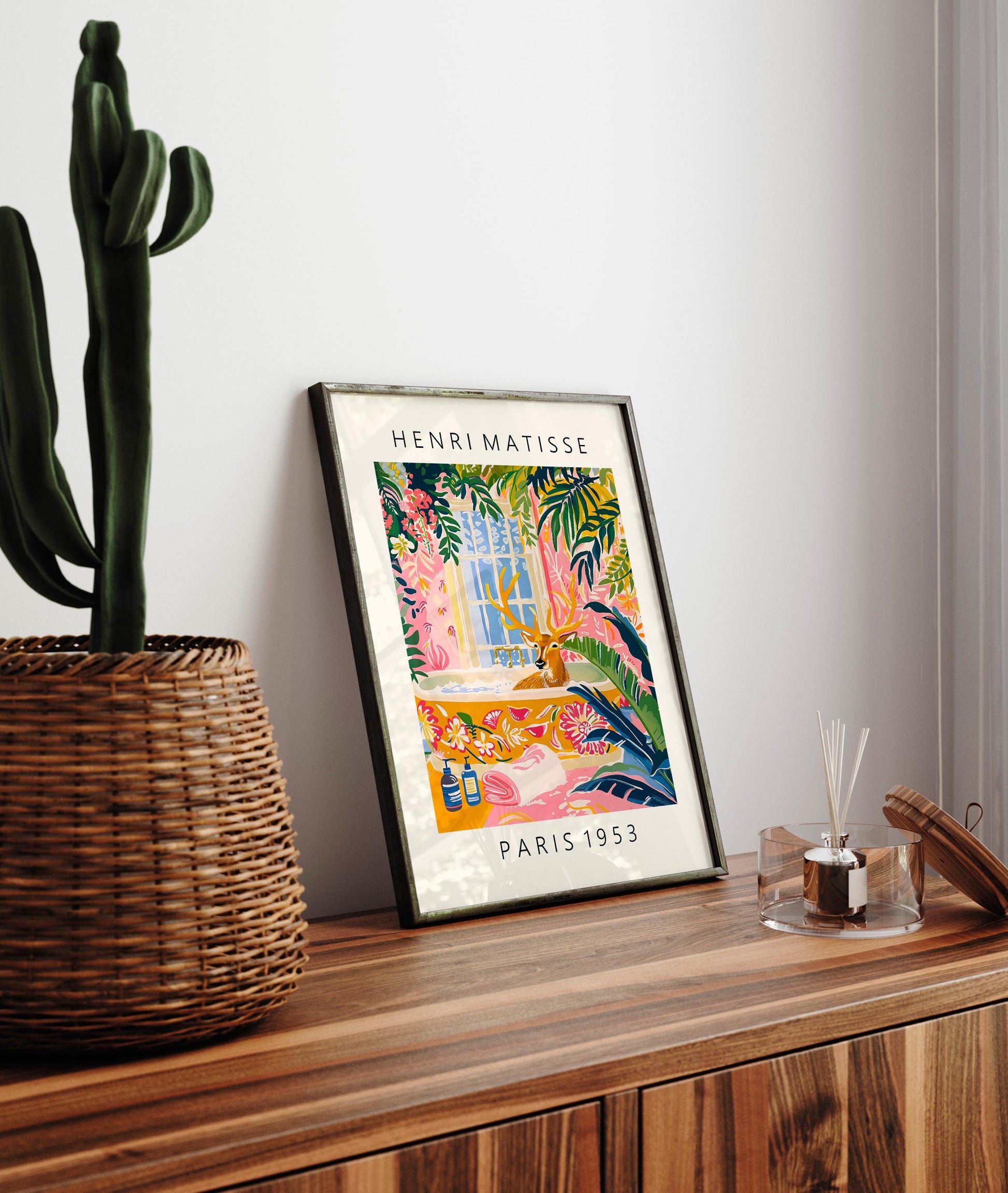 Deer in Bathtub Art Print: Maximalist Matisse Style Bathroom Wall Art