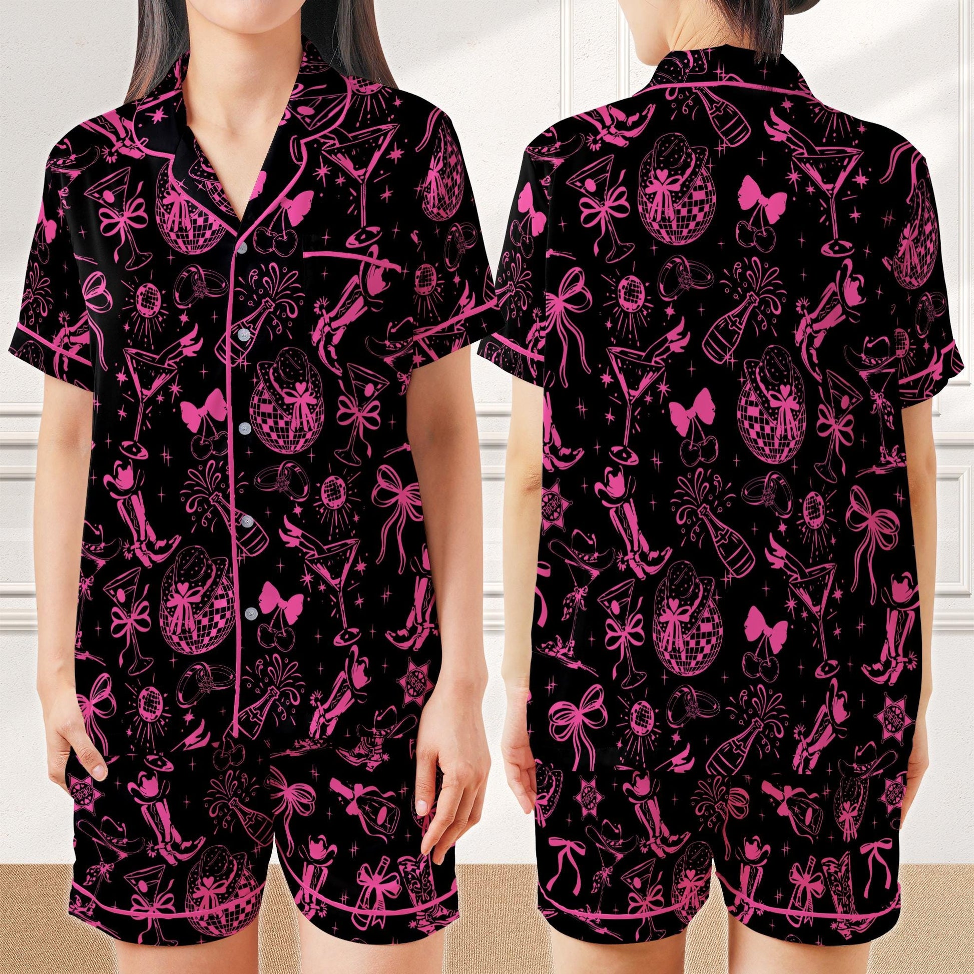 Disco Cowgirl Bachelorette Pajama Set, Coquette Pink Bow Satin Sleepwear, Cowgirl Martini Pajamas, Western Bridal Party PJs, Girly Pajamas