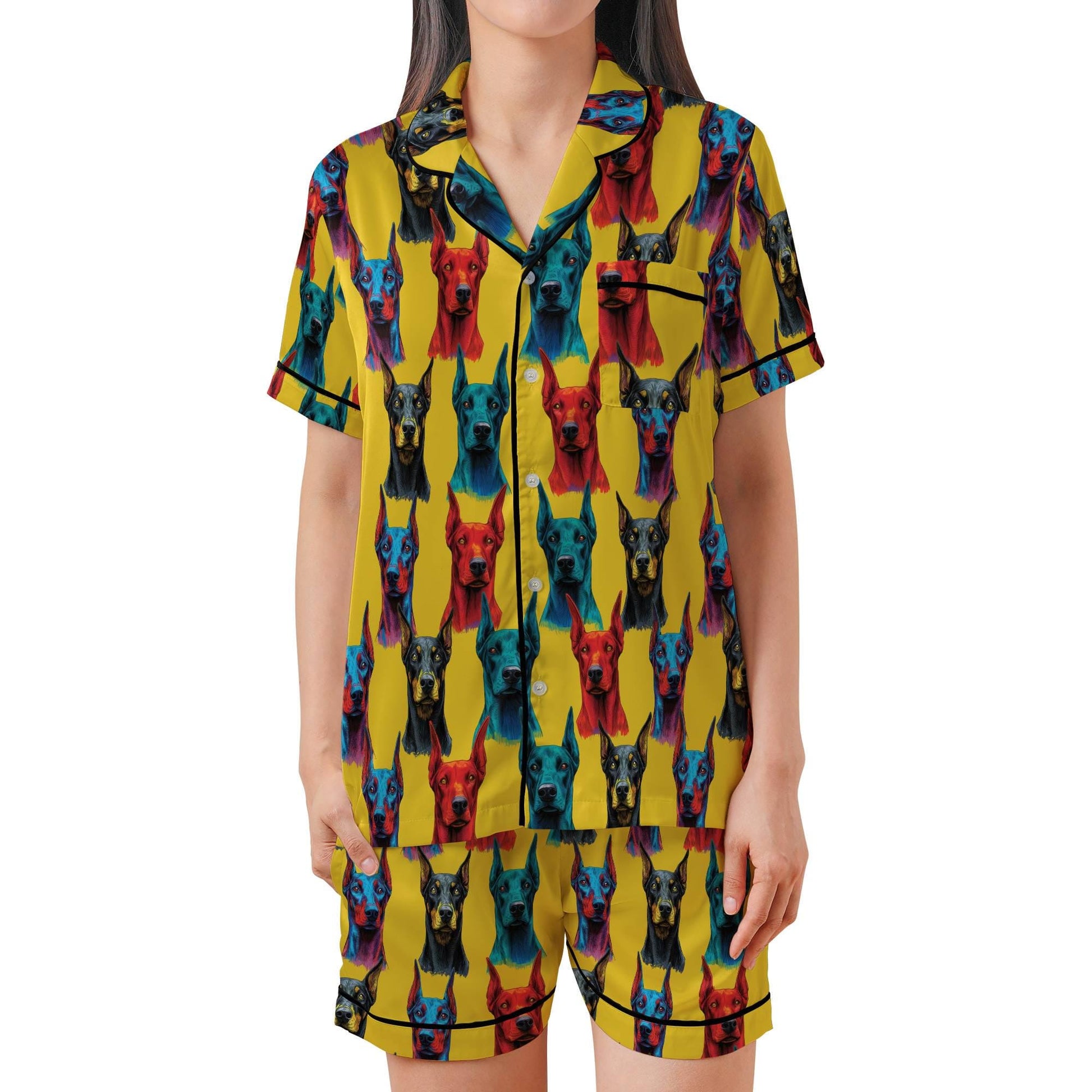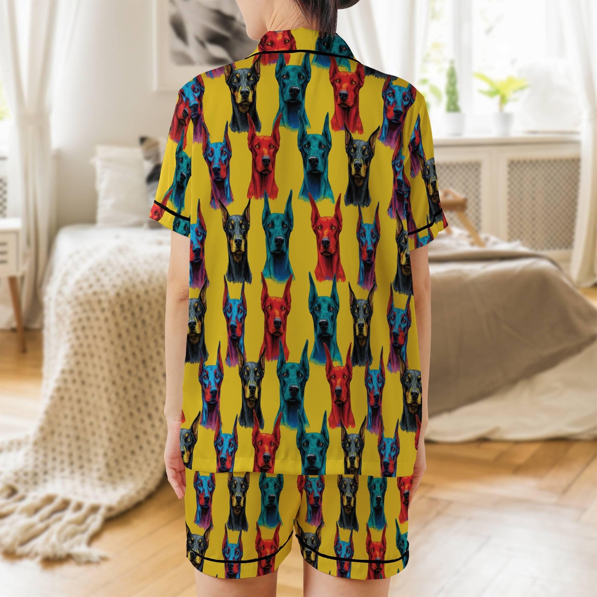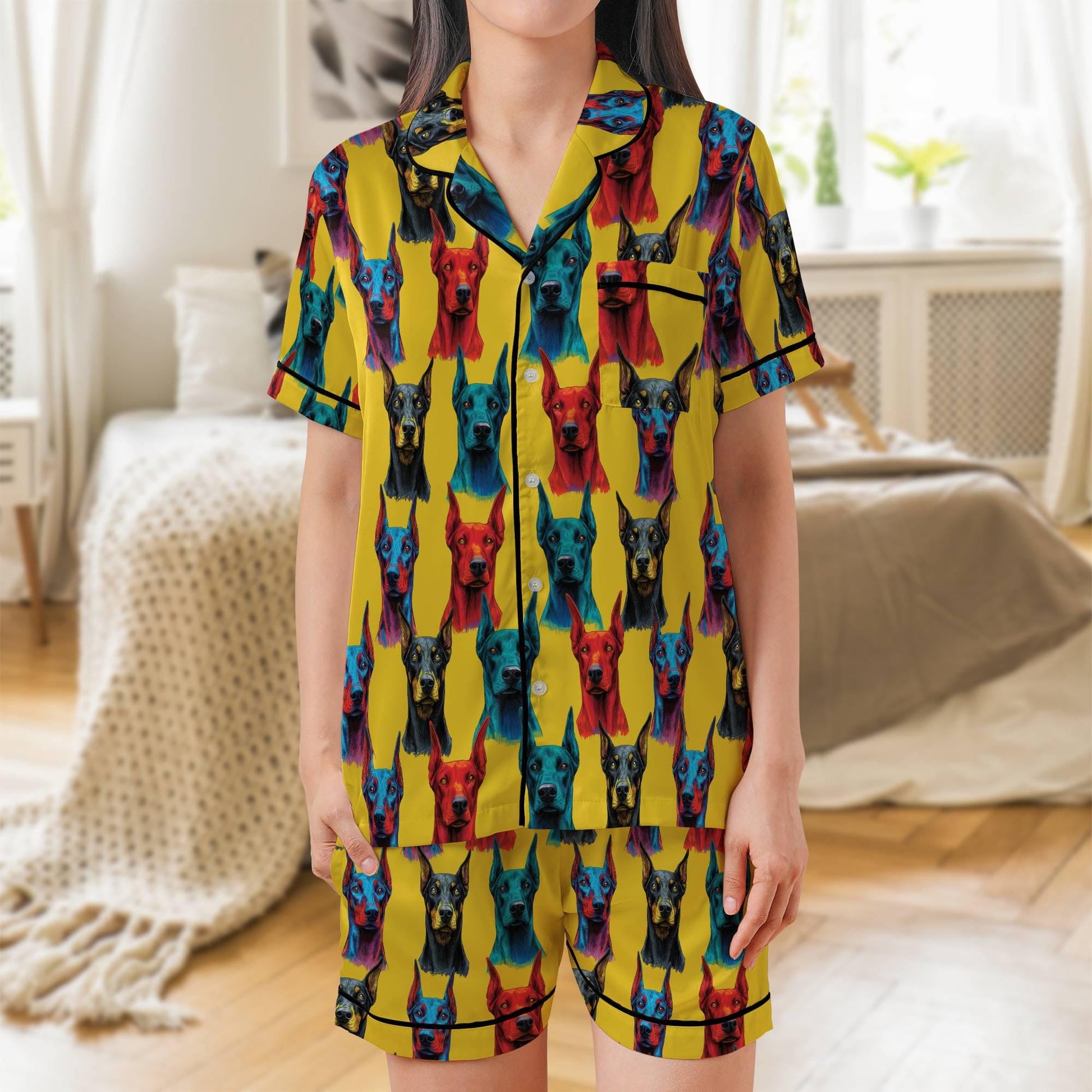 Doberman Dog Pajama Set Short Sleeves, Doberman Dog Lover Gift Woman's Satin Pajama Short Sleeve