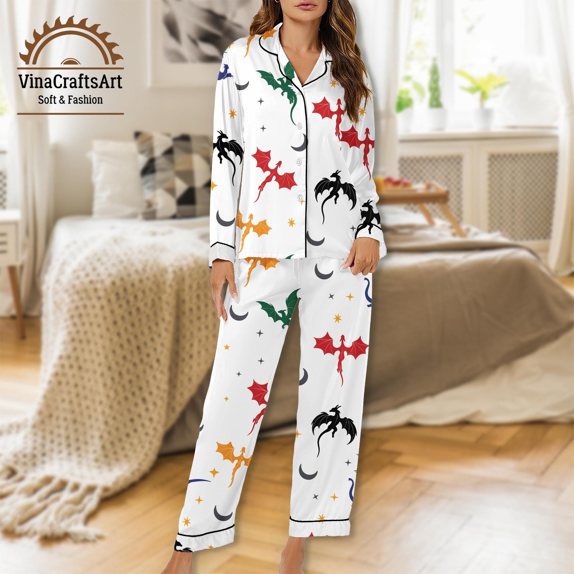 Dragon Pajamas Set, Fantasy Nightwear for Women, Colorful Dragon Moon Star Pajamas Set, Fourth Wing Pajamas Set