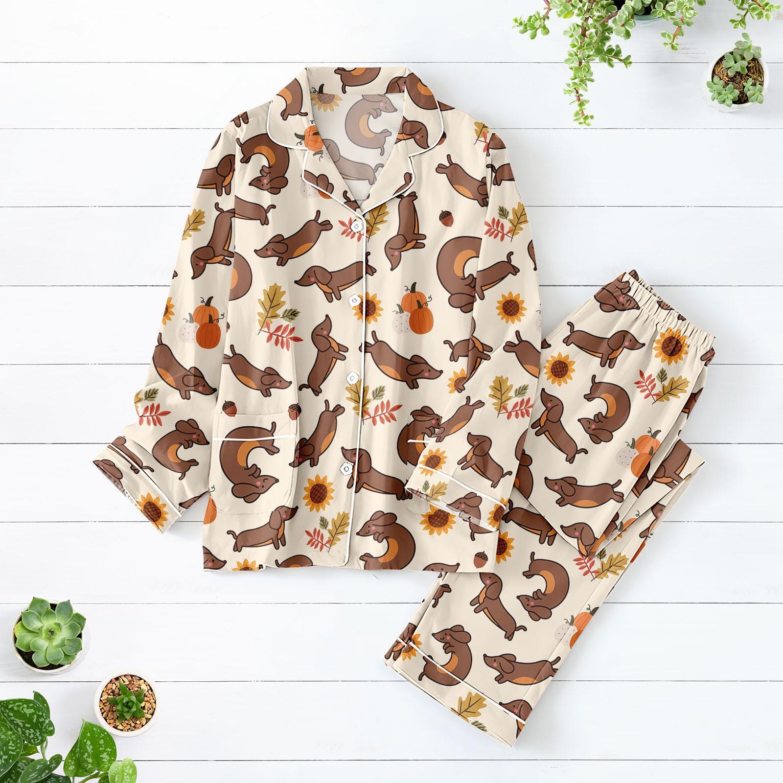 Fall Dachshund Satin Pajama Set, Autumn Wiener Dog Long PJs, Pumpkin Leaf Dog Print Sleepwear, Cozy Dog Mom Loungewear